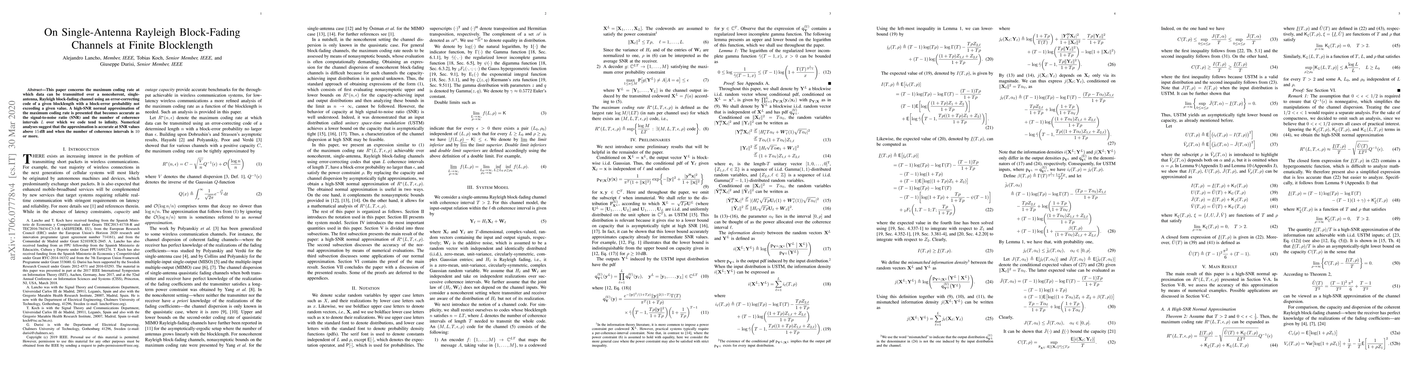 This paper explores the maximum coding rate for error-correcting codes on single-antenna Rayleigh block-fading channels, presenting a high-SNR normal approximation that is accurate at high SNR and sufficient coherence intervals. Numerical results confirm the approximation's accuracy above 15dB SNR and with at least 10 coherence intervals.