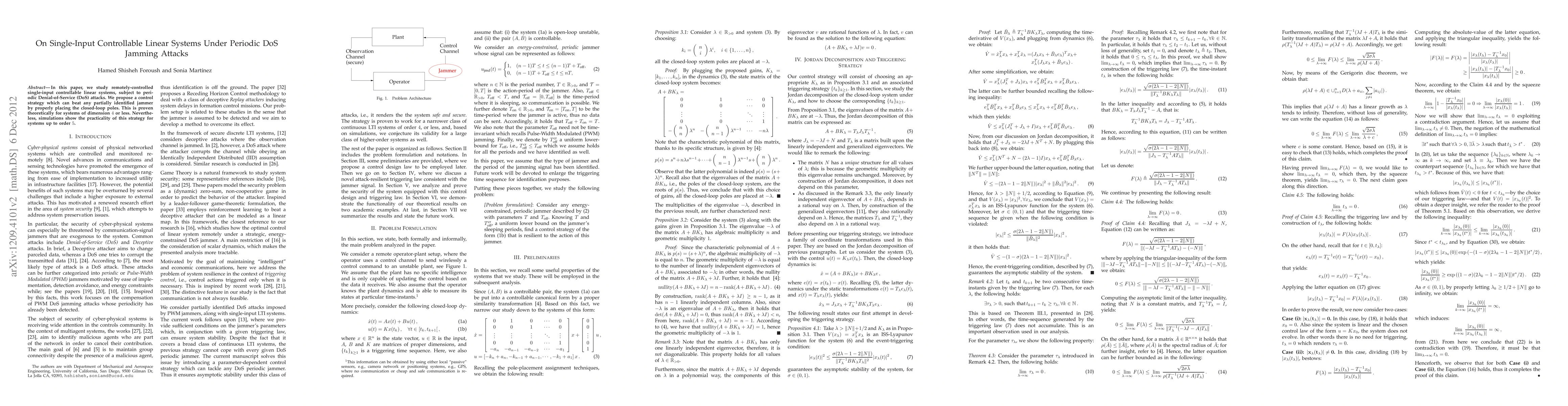 This paper proposes a control strategy for single-input controllable linear systems facing periodic Denial-of-Service attacks, successfully placing closed-loop poles to outmaneuver jammers. Theoretical proofs cover systems up to dimension 4, while simulations extend its effectiveness to systems up to order 5.