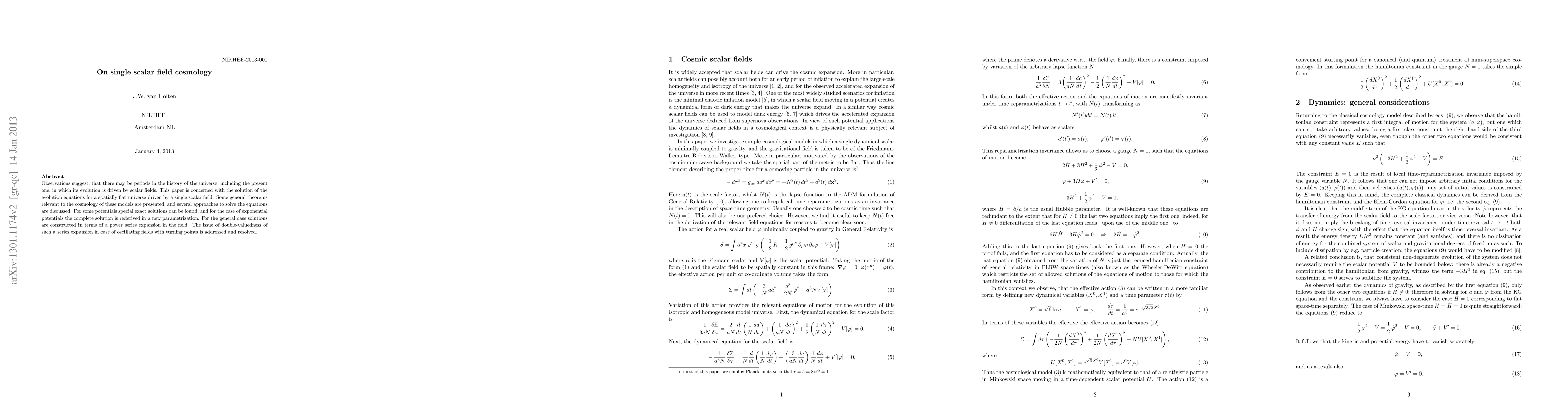 This paper explores the evolution of a spatially flat universe driven by a single scalar field, presenting general theorems and various solution methods for the associated equations. It derives exact solutions for specific potentials and constructs power series solutions for the general case, addressing and resolving issues of double-valuedness in oscillating fields.