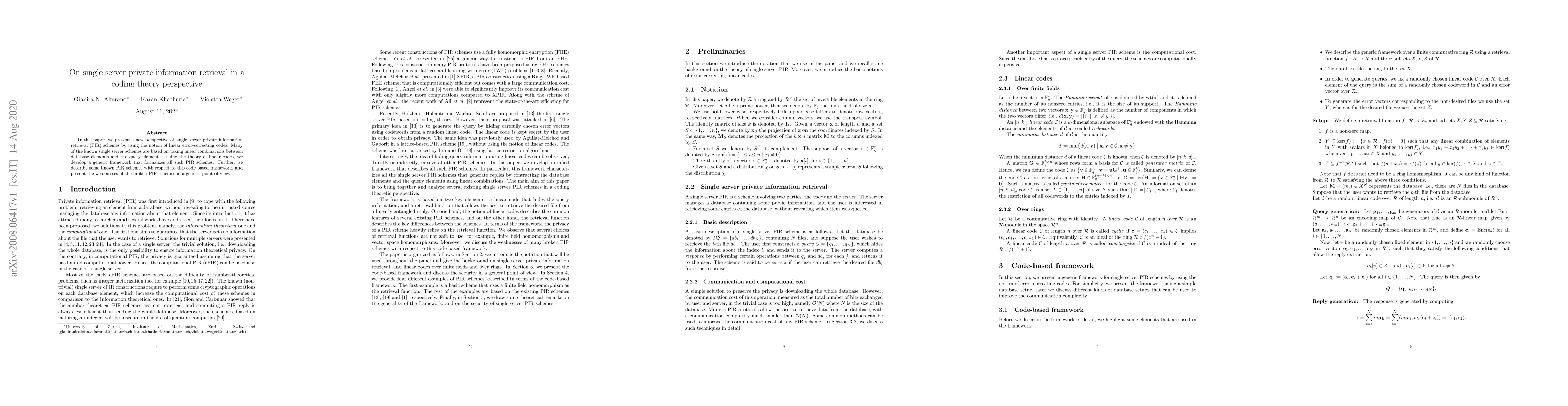 This paper introduces a coding theory framework for single server private information retrieval (PIR) schemes using linear error-correcting codes, formalizing existing PIR methods and highlighting the weaknesses of broken schemes from a generic perspective.