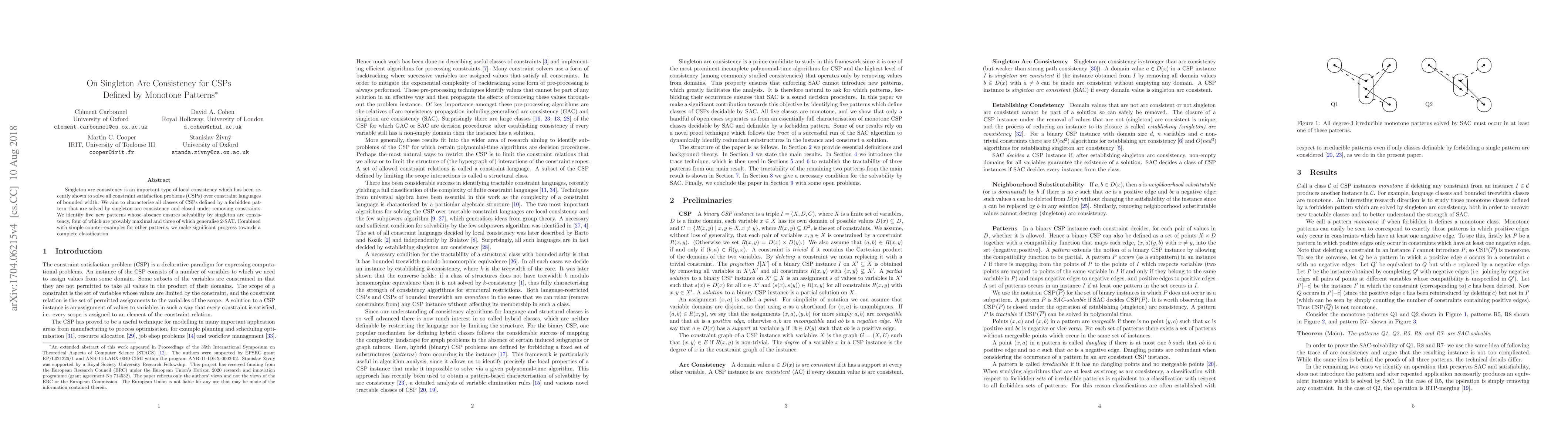 This paper investigates singleton arc consistency in solving constraint satisfaction problems (CSPs) defined by monotone patterns. It identifies five new patterns that, when absent, ensure CSPs are solvable by singleton arc consistency, contributing to the classification of CSPs solvable by this method.