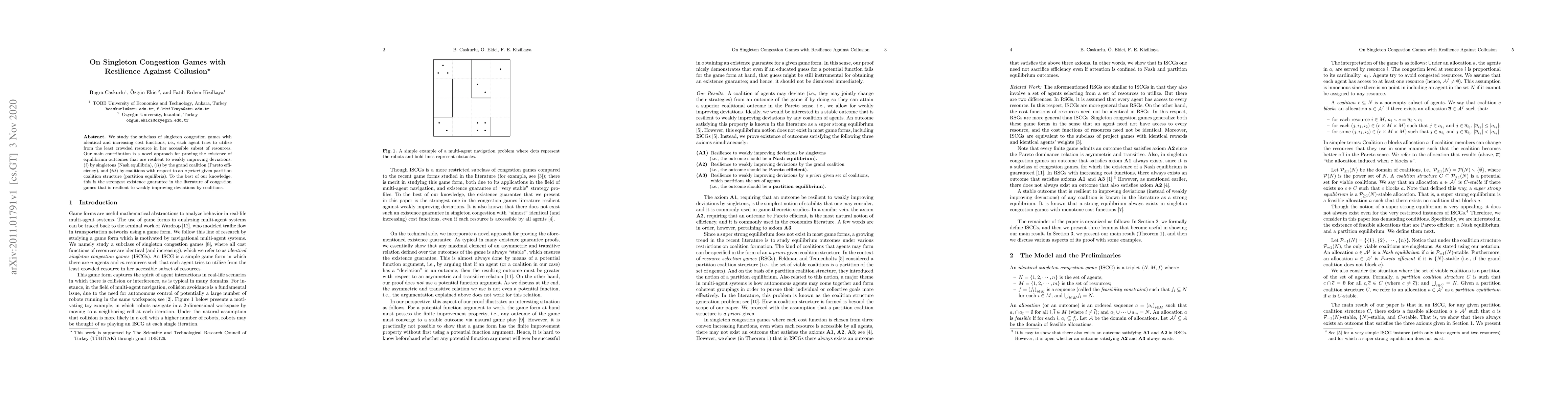 This paper investigates singleton congestion games with identical and increasing cost functions, focusing on the existence of equilibrium outcomes resilient to weakly improving deviations by singletons, coalitions, and predefined partition structures. The authors present a novel approach to prove such equilibria, offering the strongest known existence guarantee in the congestion games literature.