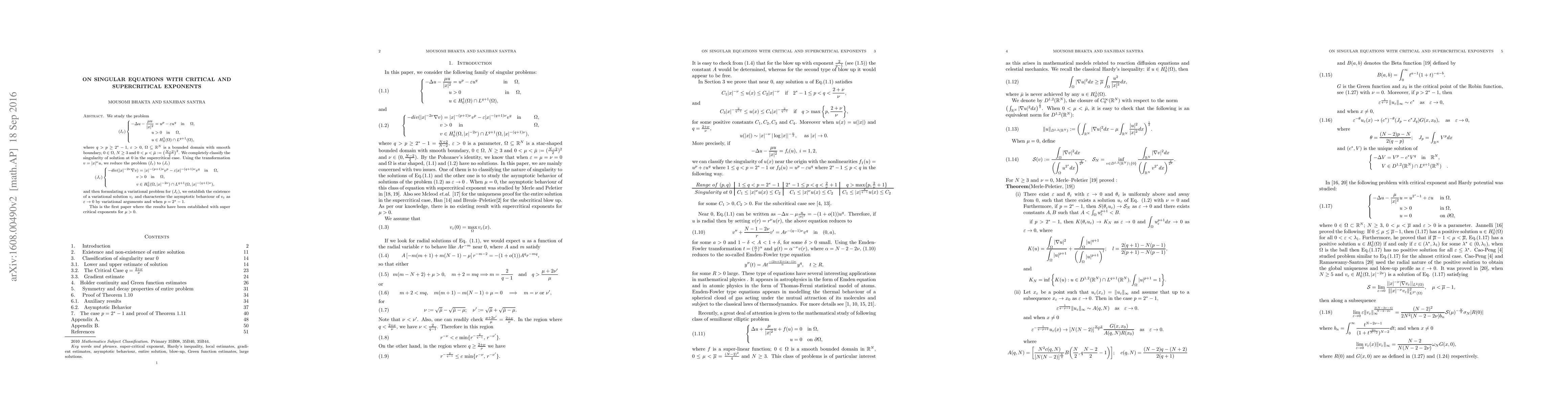 We study the problem \begin{equation*} (I_{\epsilon}) \left\{\begin{aligned} -\Delta u- \frac{\mu u}{|x|^2}&=u^p -\epsilon u^q \quad\text{in }\quad \Omega, \\ u&>0 \quad\text{in }\quad \Omega, \\ u &\in H^1_0(\Omega)\cap L^{q+1}(\Omega), \end{aligned} \right. \end{equation*} where $q>p\geq 2^*-1$, $\epsilon>0$ is a parameter, $\Omega\subseteq\mathbb{R}^N$ is a bounded domain with smooth boundary, $0\in \Omega$, $N\geq 3$ and $0<\mu<\bar\mu:=\big(\frac{N-2}{2}\big)^2$. We prove at $0$, any solution of $(I_{\epsilon})$ has the singularity of order $|x|^{-\nu}$ when $q<\frac{2+\nu}{\nu}$ and of the order $|x|^{-\frac{2}{q-1}}$, when $q>\frac{2+\nu}{\nu}$, where $\nu=\sqrt{\bar\mu}-\sqrt{\bar\mu-\mu}$. Moreover, we show that when $q=\frac{2+\nu}{\nu}$ and $u$ is radial, $u\sim |x|^{-\nu}|\log|x||^{-\frac{\nu}{2}}$. This gives the complete classification of singularity at $0$ in the supercritical case. We also obtain gradient estimate. Using the transformation $v=|x|^{\nu}u$, we reduce the problem $(I_{\epsilon})$ to $(J_{\epsilon})$ \begin{equation*} (J_{\epsilon}) \left\{\begin{aligned} -div(|x|^{-2\nu} \nabla v)&=|x|^{-(p+1)\nu} v^p -\epsilon |x|^{-(q+1)\nu} v^q \quad\text{in }\quad \Omega, \\ v&>0 \quad\text{in }\quad \Omega, \\ v& \in H^1_0(\Omega, |x|^{-2\nu} )\cap L^{q+1}(\Omega, |x|^{-(q+1)\nu} ), \end{aligned} \right. \end{equation*} and then formulating a variational problem for $(J_{\epsilon})$, we establish the existence of a variational solution $v_{\epsilon}$. Furthermore, we characterize the asymptotic behavior of $v_{\epsilon}$ as $\epsilon\to 0$ by variational arguments and when $p=2^*-1$, we show how the solution $v_{\epsilon}$ blows-up at $0$. This is the first paper where the results have been established with super critical exponents for $\mu>0$.