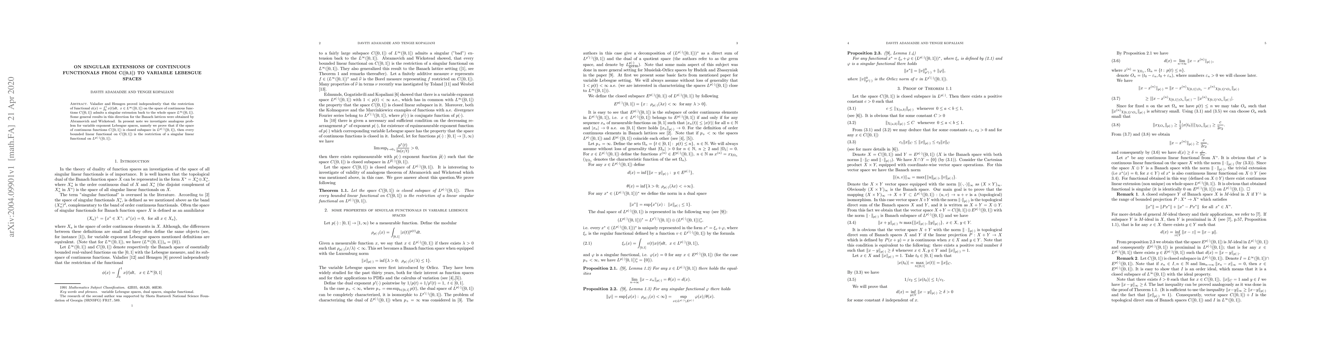 Valadier and Hensgen proved independently that the restriction of functional $\phi(x)=\int_{0}^{1}x(t)dt,\,\,x\in L^{\infty}([0,1])$ on the space of continuous functions $C([0,1])$ admits a singular extension back to the whole space $L^{\infty}([0,1]).$ Some general results in this direction for the Banach lattices were obtained by Abramovich and Wickstead. In present note we investigate analogous problem for variable exponent Lebesgue spaces, namely we prove that if the space of continuous functions $C([0,1])$ is closed subspace in $L^{p(\cdot)}([0,1]),$ then every bounded linear functional on $C([0,1])$ is the restriction of a singular linear functional on $L^{p(\cdot)}([0,1])$.