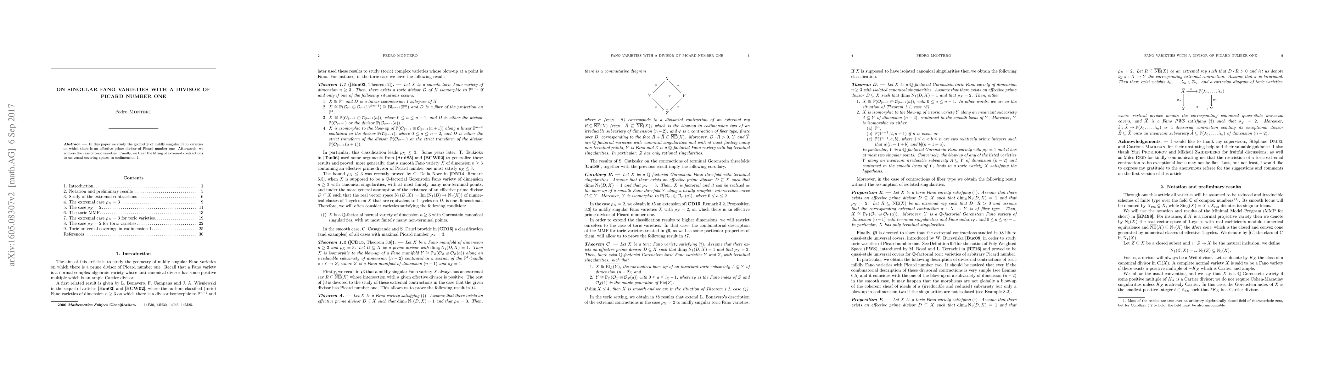 This paper investigates the geometry of singular Fano varieties featuring an effective prime divisor with a Picard number of one, focusing on toric varieties and exploring the lifting of extremal contractions to universal covering spaces in codimension 1.