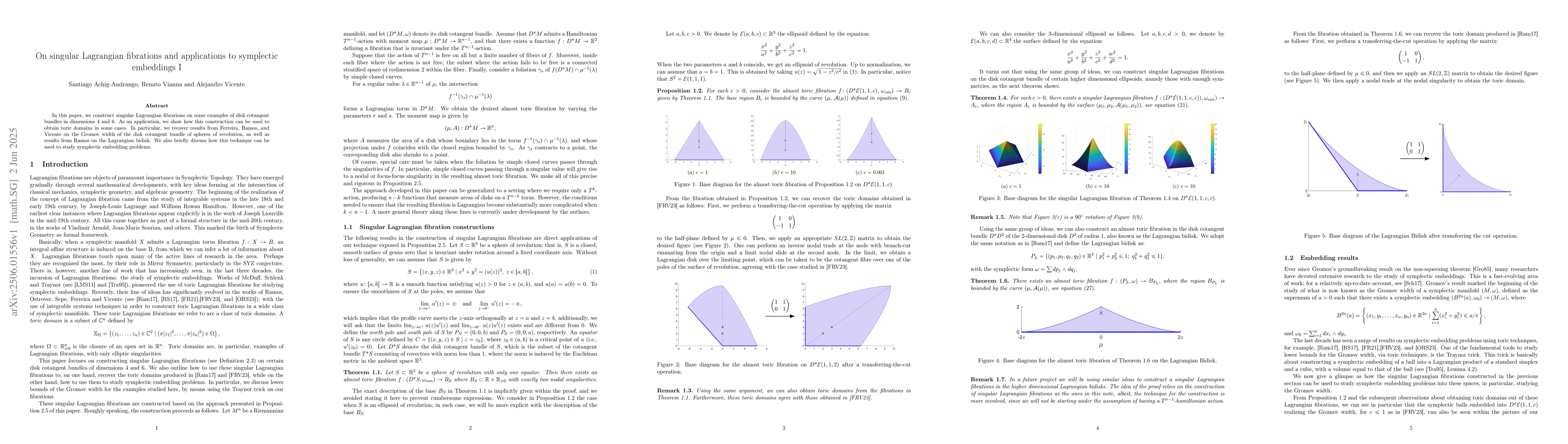 The paper constructs singular Lagrangian fibrations on examples of 4 and 6-dimensional disk cotangent bundles, employing these constructions to derive toric domains in specific cases.