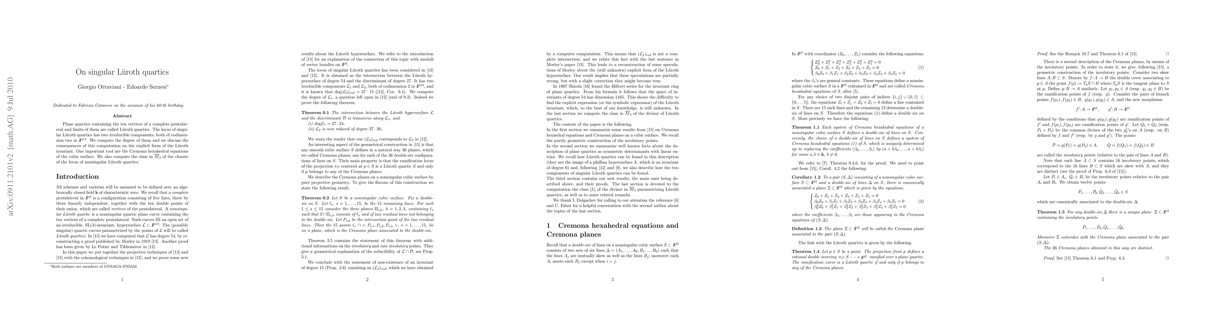 Plane quartics containing the ten vertices of a complete pentalateral and limits of them are called L\"uroth quartics. The locus of singular L\"uroth quartics has two irreducible components, both of codimension two in $\P^{14}$. We compute the degree of them and we discuss the consequences of this computation on the explicit form of the L\"uroth invariant. One important tool are the Cremona hexahedral equations of the cubic surface. We also compute the class in $\overline{M}_3$ of the closure of the locus of nonsingular L\"uroth quartics.