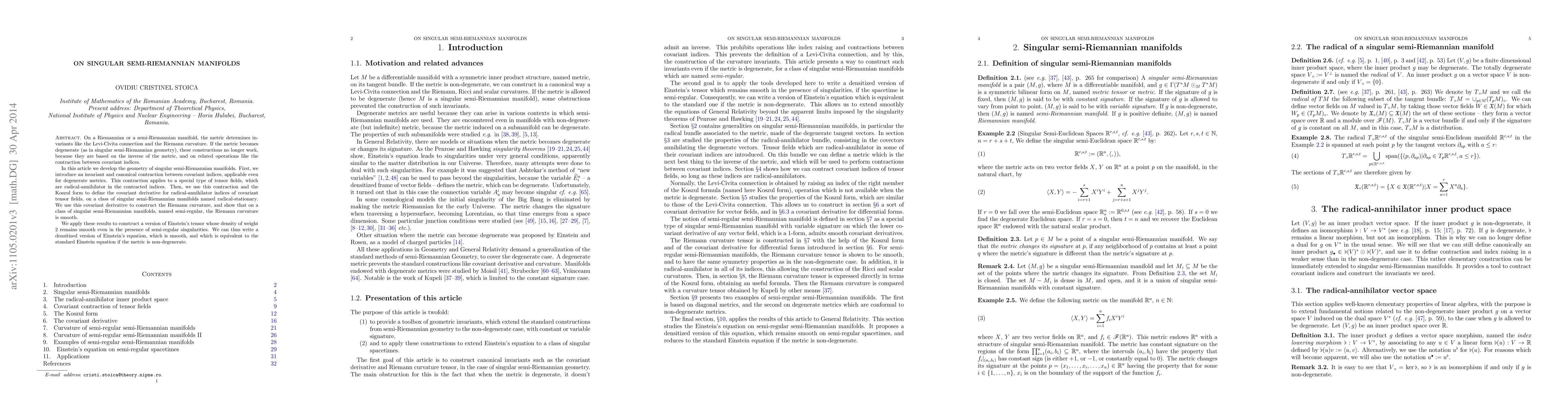This paper develops the geometry of singular semi-Riemannian manifolds, introducing a canonical contraction for covariant indices applicable to degenerate metrics. It constructs a smooth Riemann curvature and a densitized Einstein's tensor, enabling the formulation of a smooth, equivalent version of Einstein's equation in the presence of semi-regular singularities.
