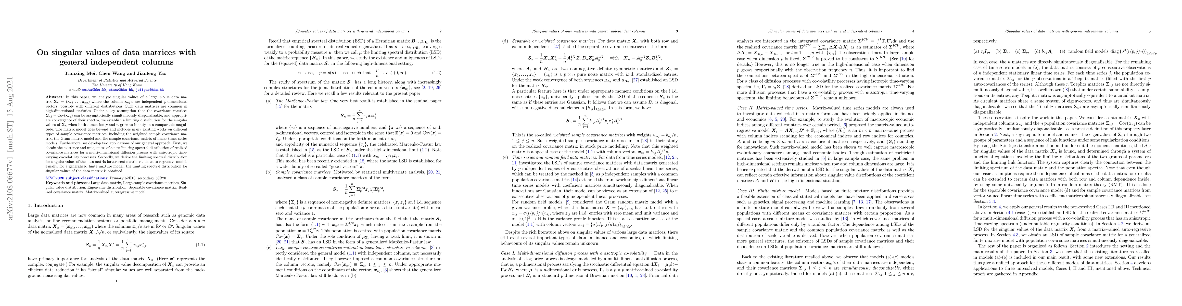 In this paper, we analyse singular values of a large $p\times n$ data matrix $\mathbf{X}_n= (\mathbf{x}_{n1},\ldots,\mathbf{x}_{nn})$ where the column $\mathbf{x}_{nj}$'s are independent $p$-dimensional vectors, possibly with different distributions. Such data matrices are common in high-dimensional statistics. Under a key assumption that the covariance matrices $\mathbf{\Sigma}_{nj}=\text{Cov}(\mathbf{x}_{nj})$ can be asymptotically simultaneously diagonalizable, and appropriate convergence of their spectra, we establish a limiting distribution for the singular values of $\mathbf{X}_n$ when both dimension $p$ and $n$ grow to infinity in a comparable magnitude. The matrix model goes beyond and includes many existing works on different types of sample covariance matrices, including the weighted sample covariance matrix, the Gram matrix model and the sample covariance matrix of linear times series models. Furthermore, we develop two applications of our general approach. First, we obtain the existence and uniqueness of a new limiting spectral distribution of realized covariance matrices for a multi-dimensional diffusion process with anisotropic time-varying co-volatility processes. Secondly, we derive the limiting spectral distribution for singular values of the data matrix for a recent matrix-valued auto-regressive model. Finally, for a generalized finite mixture model, the limiting spectral distribution for singular values of the data matrix is obtained.