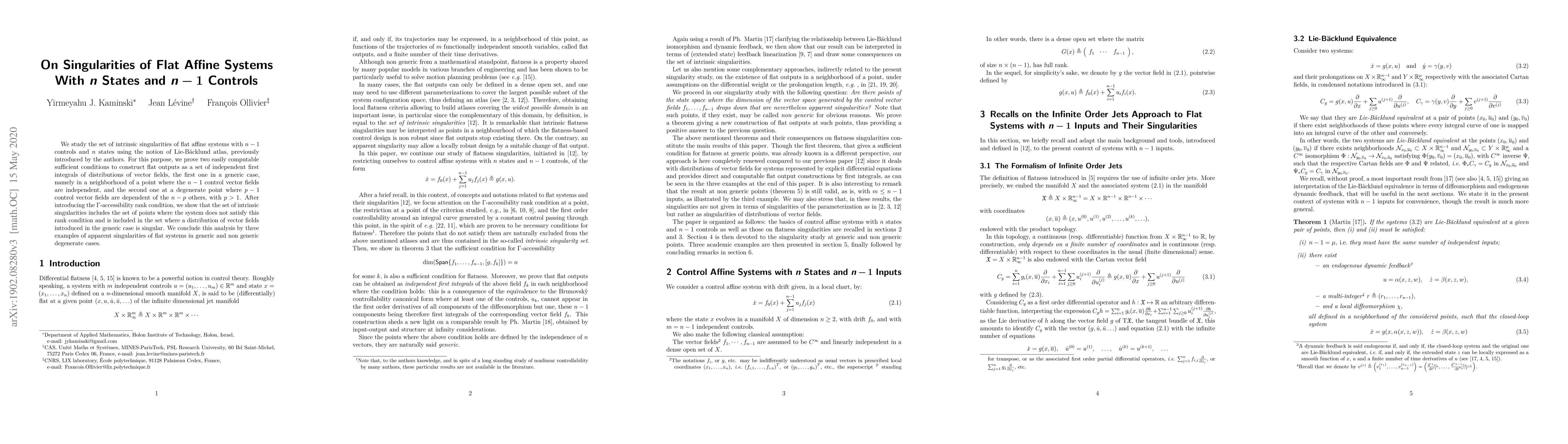 We study the set of intrinsic singularities of flat affine systems with $n-1$ controls and $n$ states using the notion of Lie-B\"acklund atlas, previously introduced by the authors. For this purpose, we prove two easily computable sufficient conditions to construct flat outputs as a set of independent first integrals of distributions of vector fields, the first one in a generic case, namely in a neighborhood of a point where the $n-1$ control vector fields are independent, and the second one at a degenerate point where $p-1$ control vector fields are dependent of the $n-p$ others, with $p>1$. We show that the set of intrinsic singularities includes the set of points where the system does not satisfy the strong accessibility rank condition and is included in the set where the distribution of vector fields, introduced in the generic case, is singular. We conclude this analysis by three examples of apparent singularites of flat systems in generic and non generic degenerate cases.