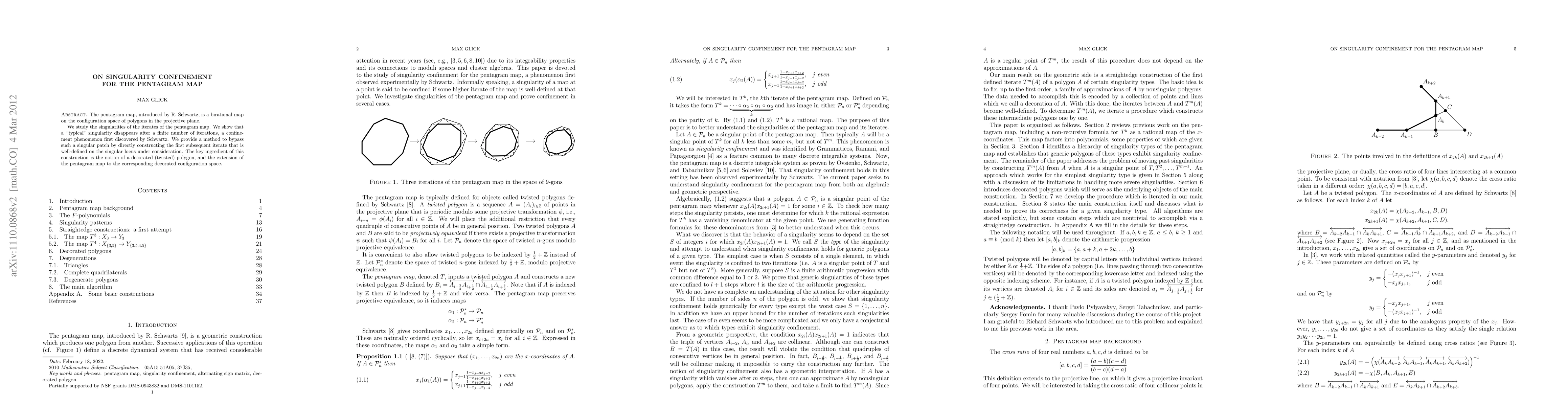 The pentagram map, introduced by R. Schwartz, is a birational map on the configuration space of polygons in the projective plane. We study the singularities of the iterates of the pentagram map. We show that a "typical" singularity disappears after a finite number of iterations, a confinement phenomenon first discovered by Schwartz. We provide a method to bypass such a singular patch by directly constructing the first subsequent iterate that is well-defined on the singular locus under consideration. The key ingredient of this construction is the notion of a decorated (twisted) polygon, and the extension of the pentagram map to the corresponding decorated configuration space.