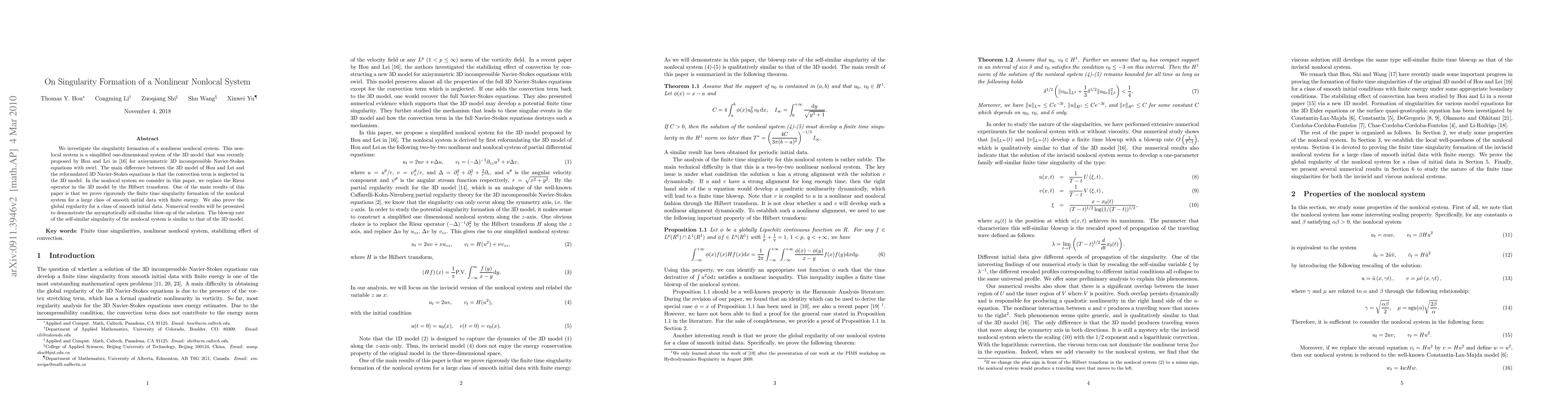 The study proves that a simplified nonlocal mathematical system can develop finite-time singularities, meaning solutions become infinite in a finite period. It also identifies conditions under which solutions remain smooth, supported by numerical evidence of self-similar blow-up behavior.