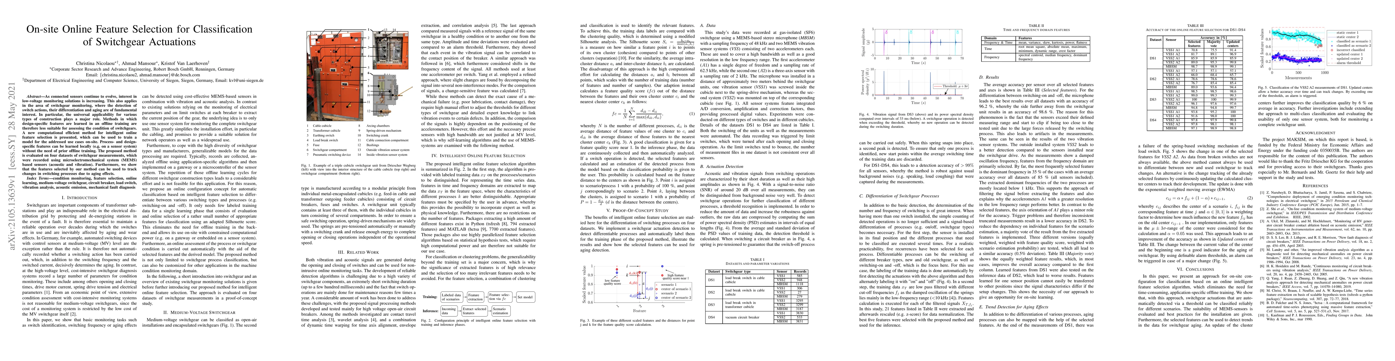 As connected sensors continue to evolve, interest in low-voltage monitoring solutions is increasing. This also applies in the area of switchgear monitoring, where the detection of switch actions, their differentiation and aging are of fundamental interest. In particular, the universal applicability for various types of construction plays a major role. Methods in which design-specific features are learned in an offline training are therefore less suitable for assessing the condition of switchgears. A new computational efficient method for intelligent online feature selection is presented, which can be used to train a model for the addressed use cases on-site. Process- and design-specific features can be learned locally (e.g. on a sensor system) without the need of prior offline training. The proposed method is evaluated on four datasets of switchgear measurements, which were recorded using microelectromechanical system (MEMS) based sensors (acoustic and vibration). Furthermore, we show that the features selected by our method can be used to track changes in switching processes due to aging effects.