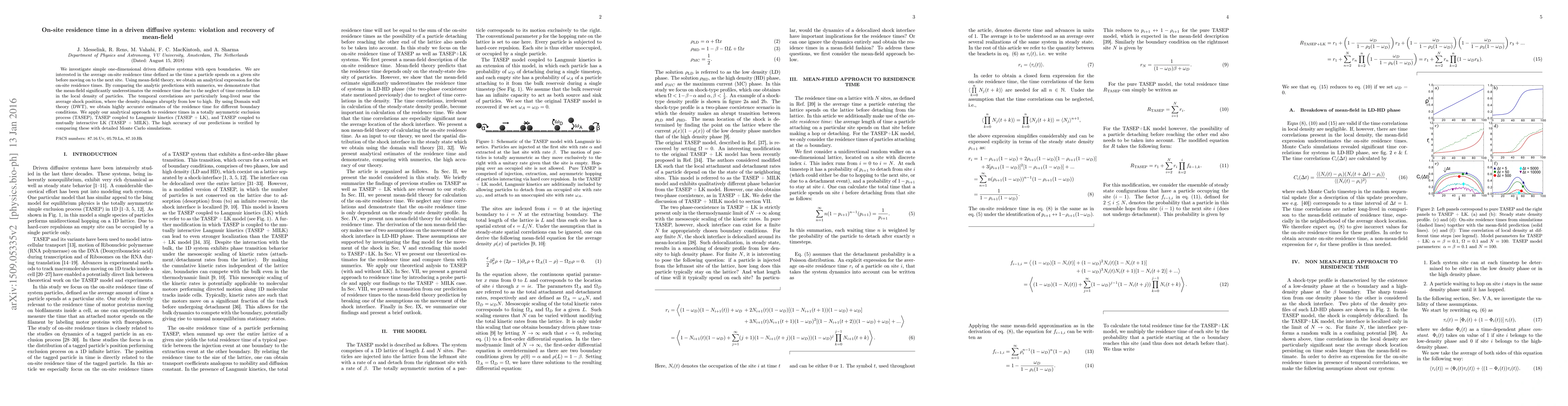 This paper investigates the average on-site residence time in one-dimensional driven diffusive systems, finding that mean-field theory underestimates residence times due to ignored temporal correlations. Using Domain wall theory, the authors achieve highly accurate predictions verified by Monte Carlo simulations for various processes including TASEP and TASEP coupled to Langmuir kinetics.