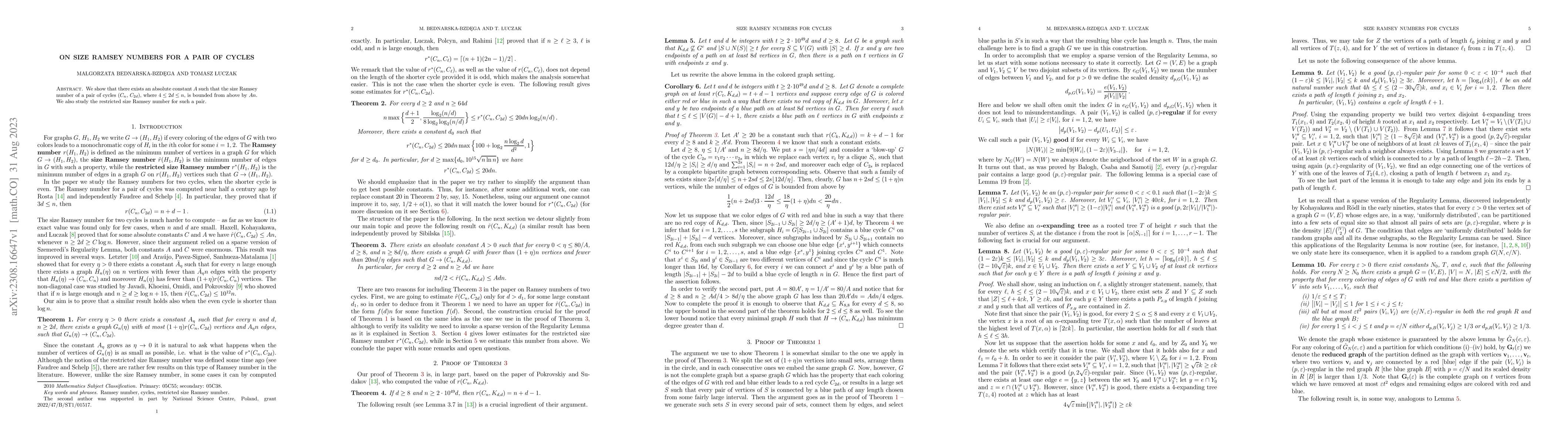 Summary: The paper establishes an upper bound for the size Ramsey number of a pair of cycles $(C_n, C_{2d})$ with $4\le 2d\le n$, showing it is bounded by a constant $A$ times $n$. It also explores the restricted size Ramsey number for these cycle pairs.