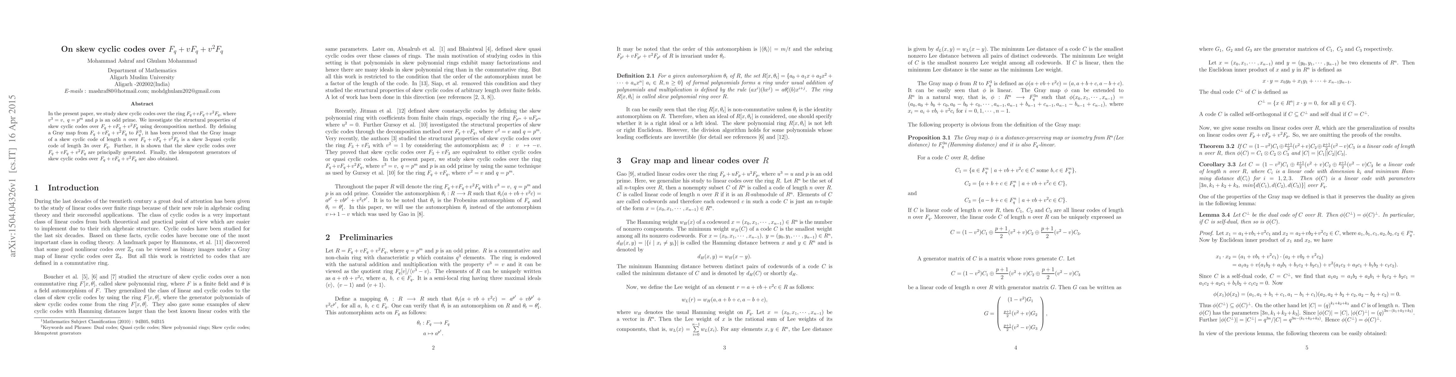 This paper investigates skew cyclic codes over the ring $F_{q}+vF_{q}+v^2F_{q}$, where $v^3=v$. It demonstrates that the Gray image of such codes results in skew $3$-quasi cyclic codes and proves that these codes are principally generated, alongside deriving their idempotent generators.
