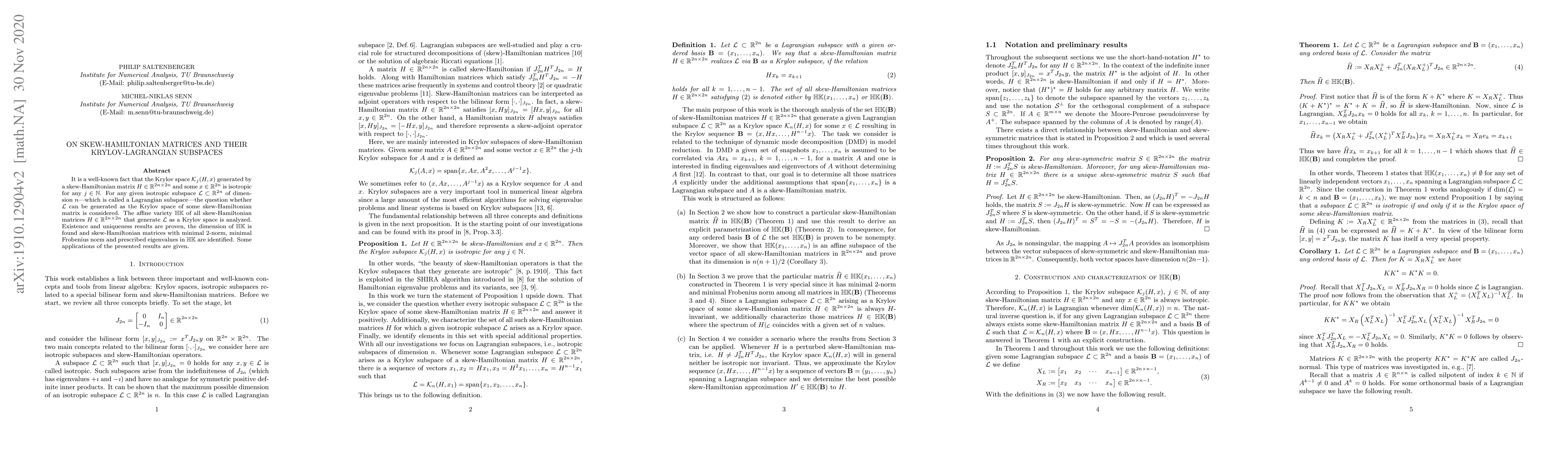 Research investigates whether isotropic subspaces can be generated as Krylov spaces of skew-Hamiltonian matrices, proving existence and uniqueness results, finding the dimension of the variety, and providing an algorithm to find a basis of the variety.