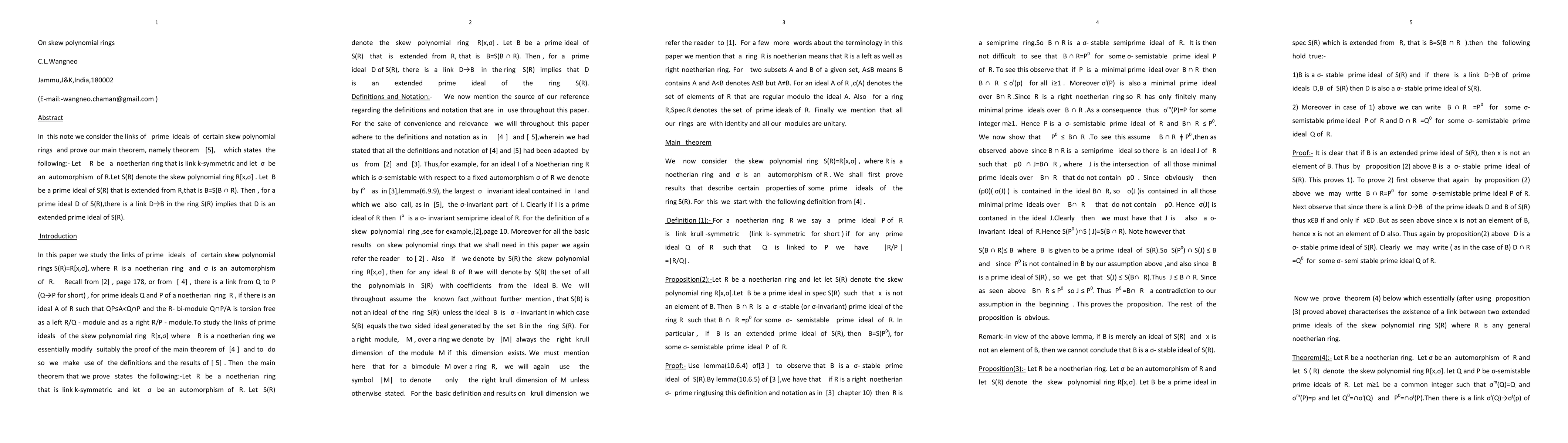 In this note we consider the links of prime ideals of certain skew polynomial rings and prove our main theorem, namely theorem [5], which states the following.Let R be a noetherian ring that is link k-symmetric and let {\sigma} be an automorphism of R.Let S(R) denote the skew polynomial ring R[x,{\sigma}]. Let B be a prime ideal of S(R) that is extended from R. Then, for a prime ideal D of S(R),there is a link D\rightarrowB in the ring S(R) implies that D is an extended prime ideal of S(R).