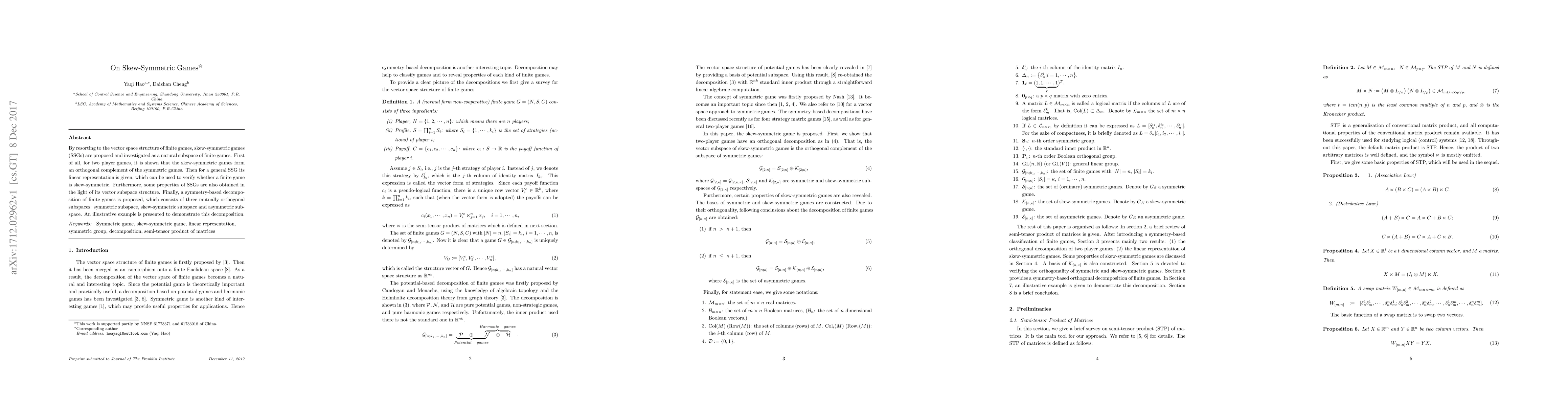 This research introduces skew-symmetric games (SSGs) as a subspace of finite games, demonstrating their orthogonal complement to symmetric games in two-player scenarios. It provides a linear representation to verify SSGs and explores their properties through vector space structure, concluding with a symmetry-based decomposition of finite games into symmetric, skew-symmetric, and asymmetric subspaces.