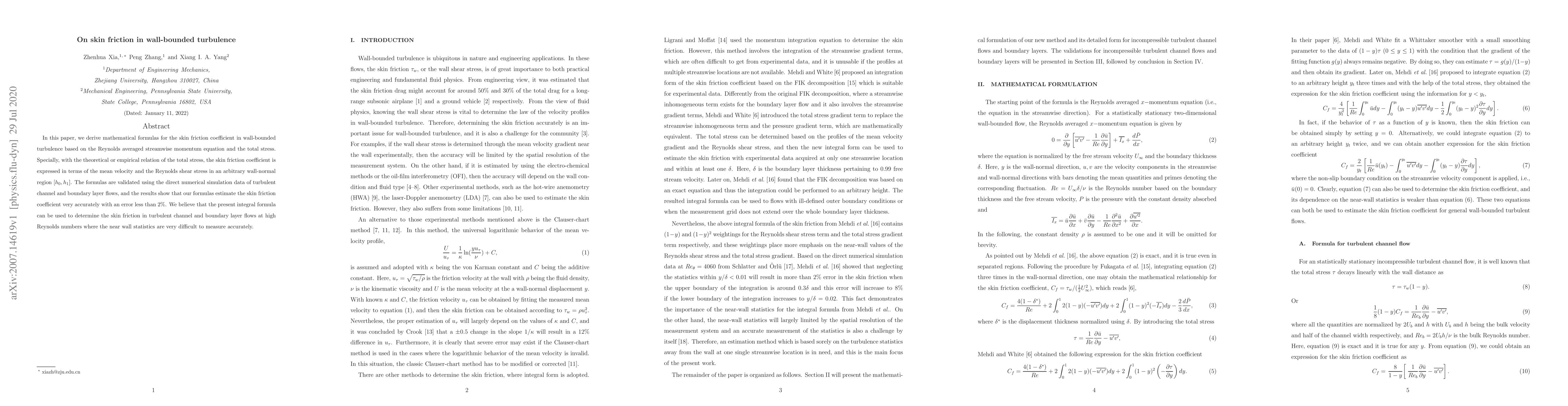 This paper derives mathematical formulas for the skin friction coefficient in wall-bounded turbulence, validated against direct numerical simulation data, showing accurate estimations with less than $2\%$ error. The formulas are proposed for determining skin friction in turbulent flows at high Reynolds numbers.