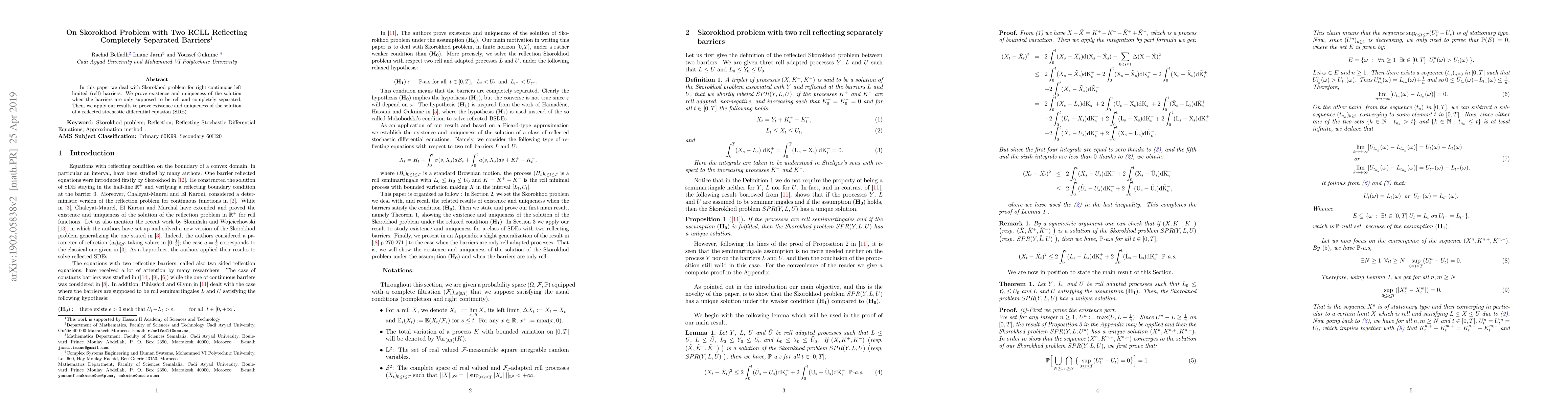 This paper establishes the existence and uniqueness of solutions for a Skorokhod problem with two right continuous left limited (RCLL) reflecting barriers that are completely separated. It further applies these results to demonstrate the existence and uniqueness of solutions for reflected stochastic differential equations (SDEs).