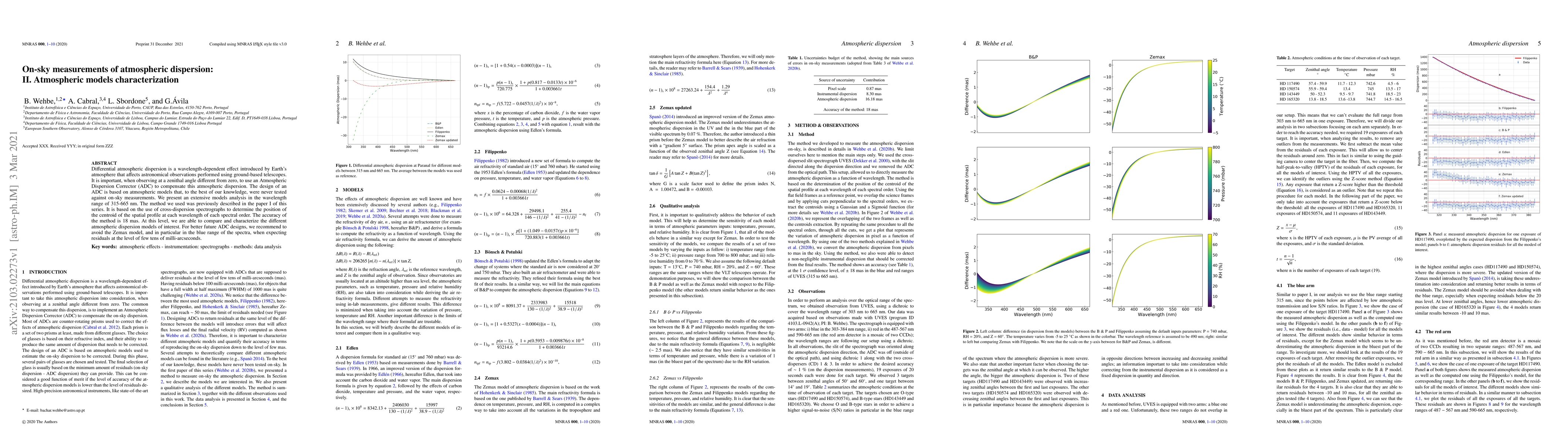 Differential atmospheric dispersion is a wavelength-dependent effect introduced by Earth's atmosphere that affects astronomical observations performed using ground-based telescopes. It is important, when observing at a zenithal angle different from zero, to use an Atmospheric Dispersion Corrector (ADC) to compensate this atmospheric dispersion. The design of an ADC is based on atmospheric models that, to the best of our knowledge, were never tested against on-sky measurements. We present an extensive models analysis in the wavelength range of 315-665 nm. The method we used was previously described in the paper I of this series. It is based on the use of cross-dispersion spectrographs to determine the position of the centroid of the spatial profile at each wavelength of each spectral order. The accuracy of the method is 18 mas. At this level, we are able to compare and characterize the different atmospheric dispersion models of interest. For better future ADC designs, we recommend to avoid the Zemax model, and in particular in the blue range of the spectra, when expecting residuals at the level of few tens of milli-arcseconds.