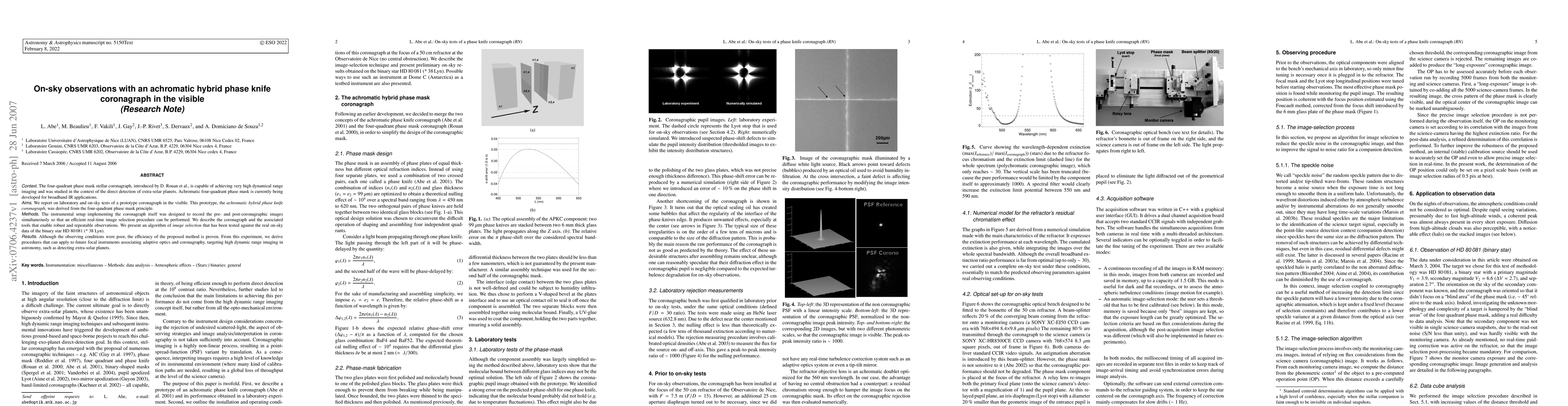CONTEXT: The four-quadrant phase mask stellar coronagraph, introduced by D. Rouan et al., is capable of achieving very high dynamical range imaging and was studied in the context of the direct detection of extra-solar planets. Achromatic four-quadrant phase mask is currently being developed for broadband IR applications. AIMS: We report on laboratory and on-sky tests of a prototype coronagraph in the visible. This prototype, the achromatic hybrid phase knife coronagraph, was derived from the four-quadrant phase mask principle. METHODS: The instrumental setup implementing the coronagraph itself was designed to record the pre- and post-coronagraphic images simultaneously so that an efficient real-time image selection procedure can be performed. We describe the coronagraph and the associated tools that enable robust and repeatable observations. We present an algorithm of image selection that has been tested against the real on-sky data of the binary star HD80081 (* 38 Lyn). RESULTS Although the observing conditions were poor, the efficiency of the proposed method is proven. From this experiment, we derive procedures that can apply to future focal instruments associating adaptive optics and coronagraphy, targeting high dynamic range imaging in astronomy, such as detecting extra-solar planets.
