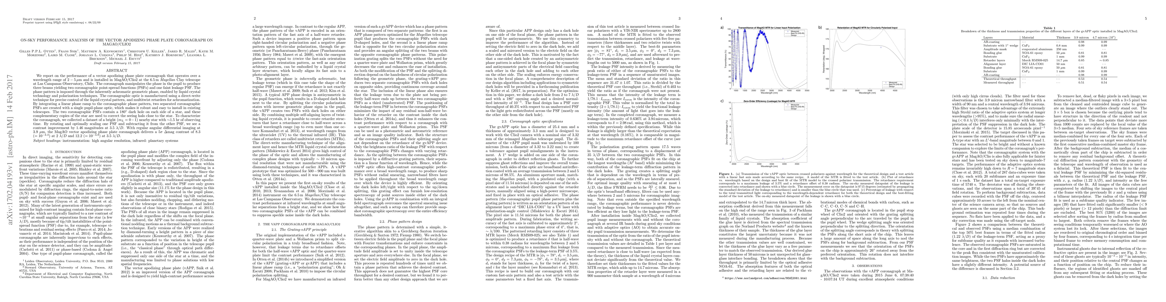 This paper evaluates the performance of a vector apodizing phase plate coronagraph on MagAO/Clio2, achieving a contrast improvement of 1.46 magnitudes at $3.5 \lambda/D$ and delivering $5\sigma$ contrast levels of 8.3 and 12.2 at 2 and $3.5 \lambda/D$, respectively.