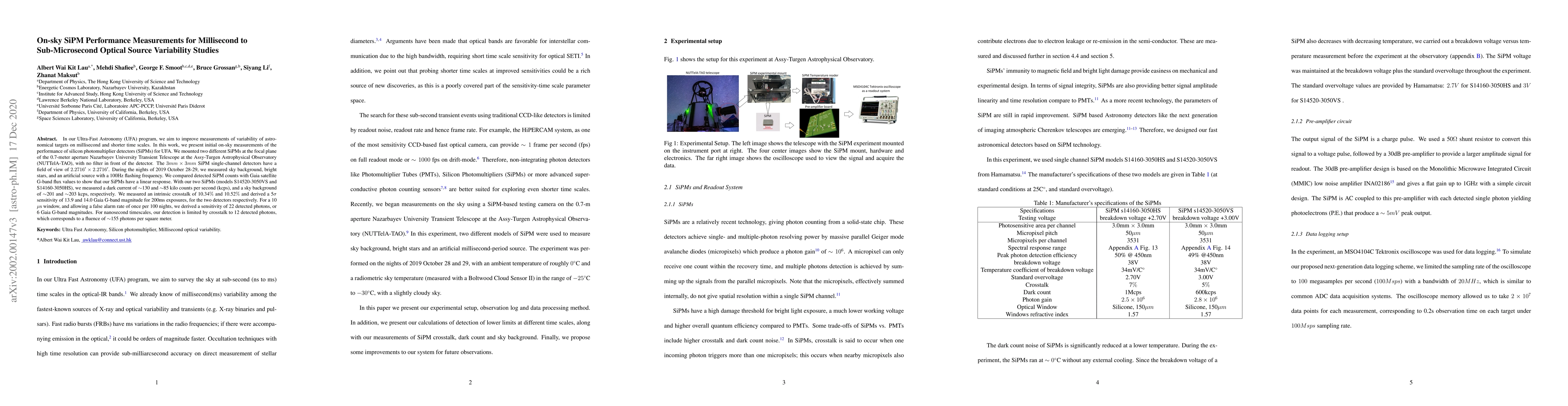 In our Ultra-Fast Astronomy (UFA) program, we aim to improve measurements of variability of astronomical targets on millisecond and shorter time scales. In this work, we present initial on-sky measurements of the performance of silicon photomultiplier detectors (SiPMs) for UFA. We mounted two different SiPMs at the focal plane of the 0.7-meter aperture Nazarbayev University Transient Telescope at the Assy-Turgen Astrophysical Observatory (NUTTelA-TAO), with no filter in front of the detector. The $3mm\times3mm$ SiPM single-channel detectors have a field of view of $2.2716'\times2.2716'$. During the nights of 2019 October 28-29, we measured sky background, bright stars, and an artificial source with a 100Hz flashing frequency. We compared detected SiPM counts with Gaia satellite G-band flux values to show that our SiPMs have a linear response. With our two SiPMs (models S14520-3050VS and S14160-3050HS), we measured a dark current of $\sim$130 and $\sim$85 kilo counts per second (kcps), and a sky background of $\sim$201 and $\sim$203 kcps, respectively. We measured an intrinsic crosstalk of 10.34$\%$ and 10.52$\%$ and derived a 5$\sigma$ sensitivity of 13.9 and 14.0 Gaia G-band magnitude for 200ms exposures, for the two detectors respectively. For a 10 $\mu$s window, and allowing a false alarm rate of once per 100 nights, we derived a sensitivity of 22 detected photons, or 6 Gaia G-band magnitudes. For nanosecond timescales, our detection is limited by crosstalk to 12 detected photons, which corresponds to a fluence of $\sim$155 photons per square meter.