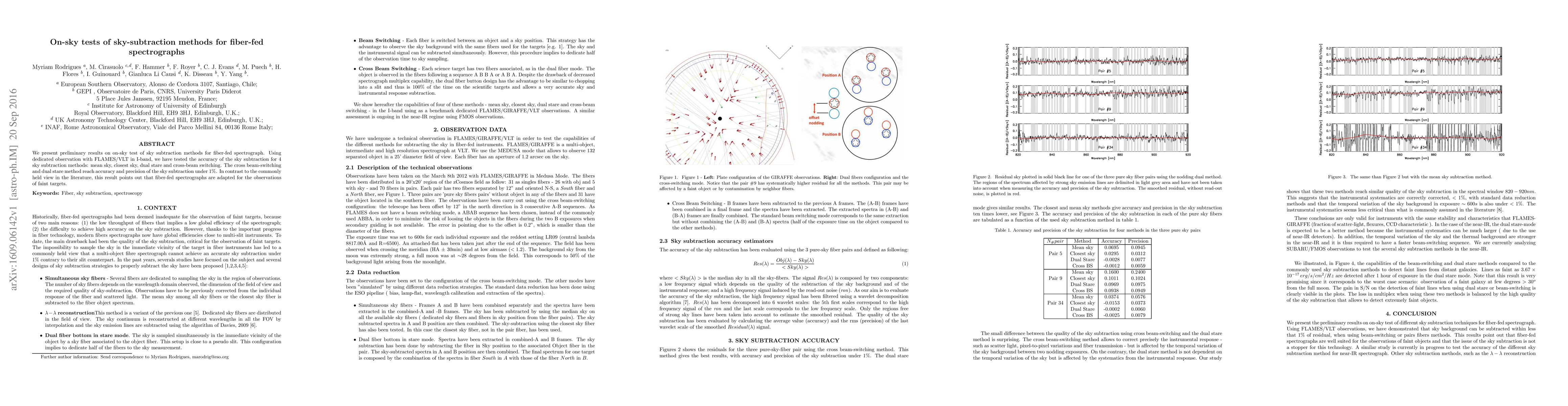 We present preliminary results on on-sky test of sky subtraction methods for fiber-fed spectrograph. Using dedicated observation with FLAMES/VLT in I-band, we have tested the accuracy of the sky subtraction for 4 sky subtraction methods: mean sky, closest sky, dual stare and cross-beam switching. The cross beam-switching and dual stare method reach accuracy and precision of the sky subtraction under 1%. In contrast to the commonly held view in the literature, this result points out that fiber-fed spectrographs are adapted for the observations of faint targets.
