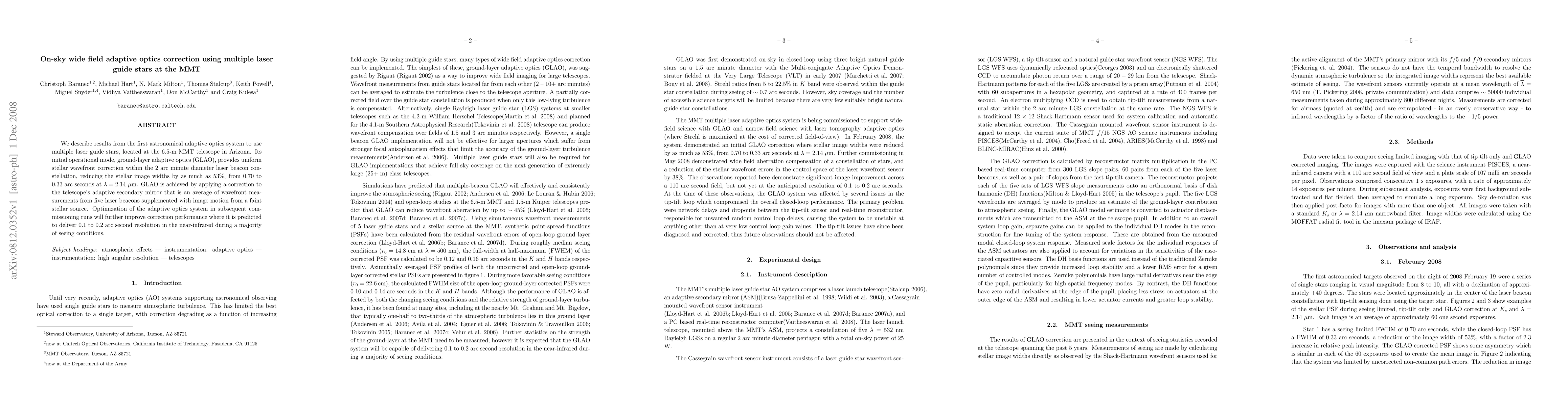 This paper reports on the first astronomical adaptive optics system using multiple laser guide stars at the MMT telescope, achieving ground-layer adaptive optics (GLAO) that reduces stellar image widths by 53%. Future optimizations aim to deliver near-infrared resolutions of 0.1 to 0.2 arc seconds.