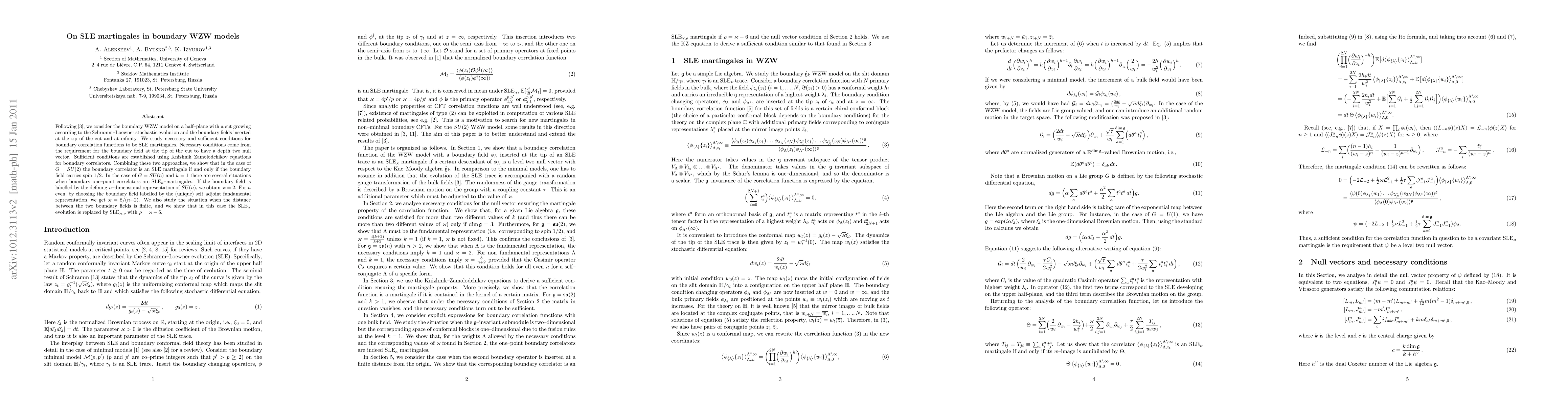 This paper investigates the boundary WZW model on a half-plane with a cut evolving according to SLE, focusing on conditions for boundary correlation functions to be SLE martingales. It finds that for G=SU(2), the boundary correlator is an SLE martingale if the boundary field has spin 1/2, and for G=SU(n) with k=1, different representations yield distinct kappa values for SLE martingales.