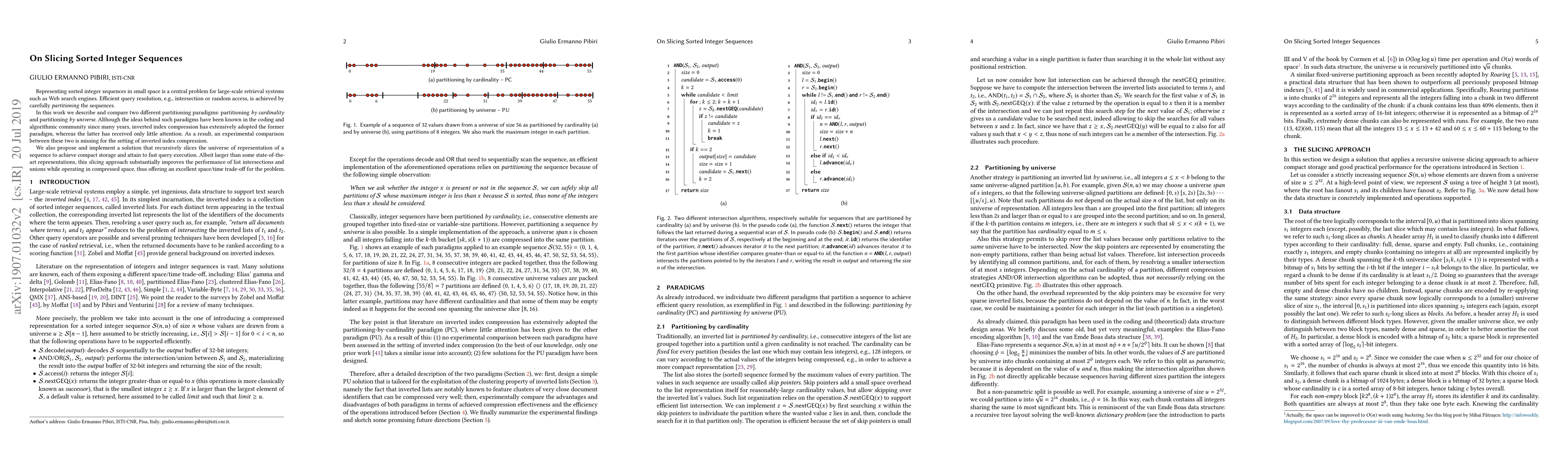 Researchers compare two partitioning paradigms for representing sorted integer sequences in small space, proposing a novel slicing approach that improves performance and offers an excellent space/time trade-off.