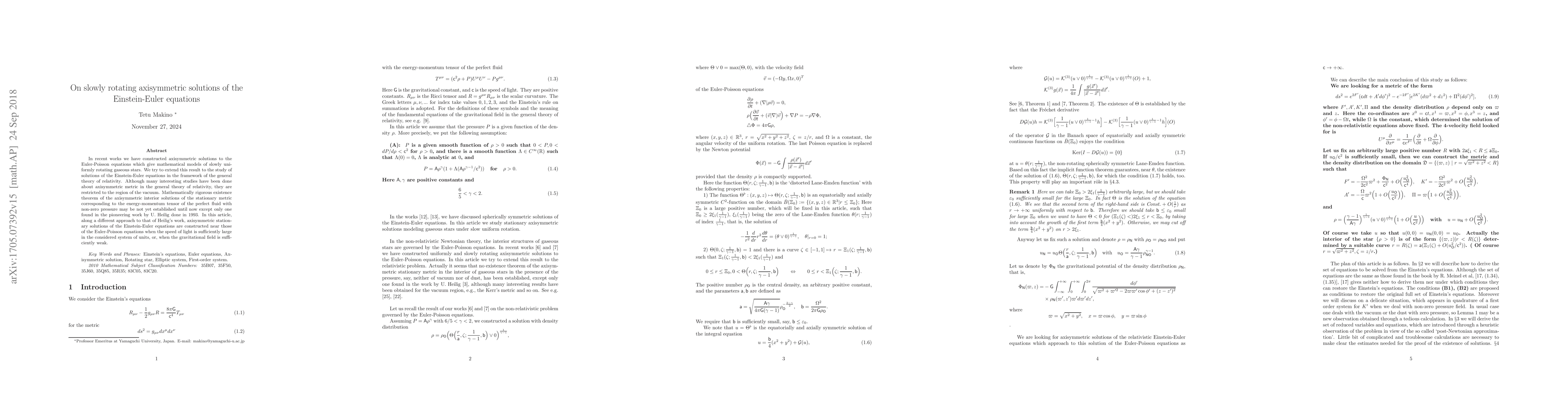 In recent works we have constructed axisymmetric solutions to the Euler-Poisson equations which give mathematical models of slowly uniformly rotating gaseous stars. We try to extend this result to the study of solutions of the Einstein-Euler equations in the framework of the general theory of relativity. Although many interesting studies have been done about axisymmetric metric in the general theory of relativity, they are restricted to the region of the vacuum. Mathematically rigorous existence theorem of the axisymmetric interior solutions of the stationary metric corresponding to the energy-momentum tensor of the perfect fluid with non-zero pressure may be not yet established until now except only one found in the pioneering work by U. Heilig done in 1993. In this article, along a different approach to that of Heilig's work, axisymmetric stationary solutions of the Einstein-Euler equations are constructed near those of the Euler-Poisson equations when the speed of light is sufficiently large in the considered system of units, or, when the gravitational field is sufficiently weak.