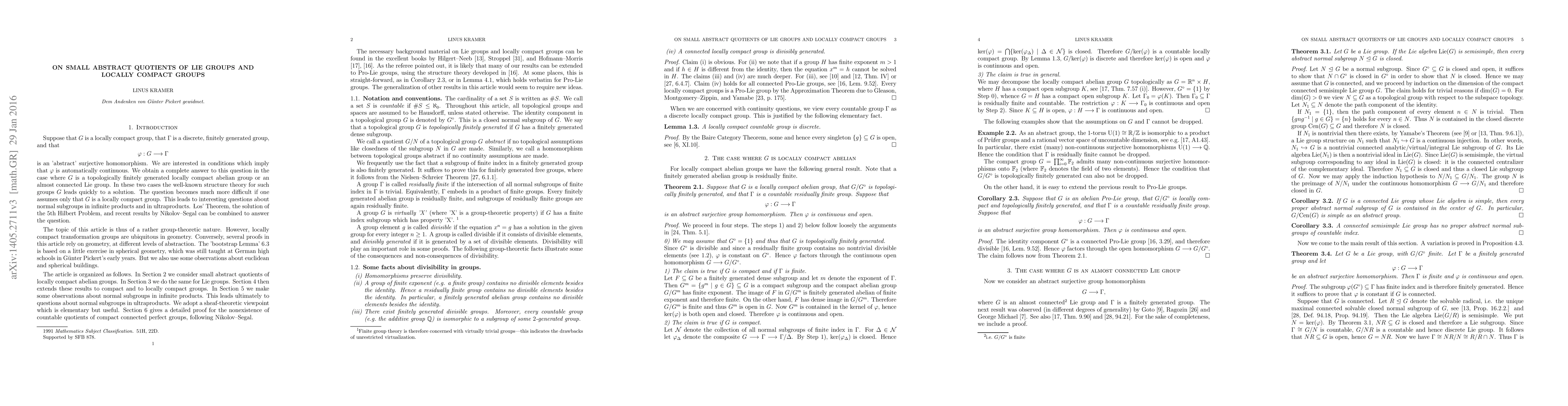 Summary: This paper establishes continuity results for abstract epimorphisms from locally compact groups to finitely generated groups, demonstrating the structural properties of such quotients. The findings contribute to the understanding of algebraic and topological characteristics in the context of Lie groups and locally compact groups.