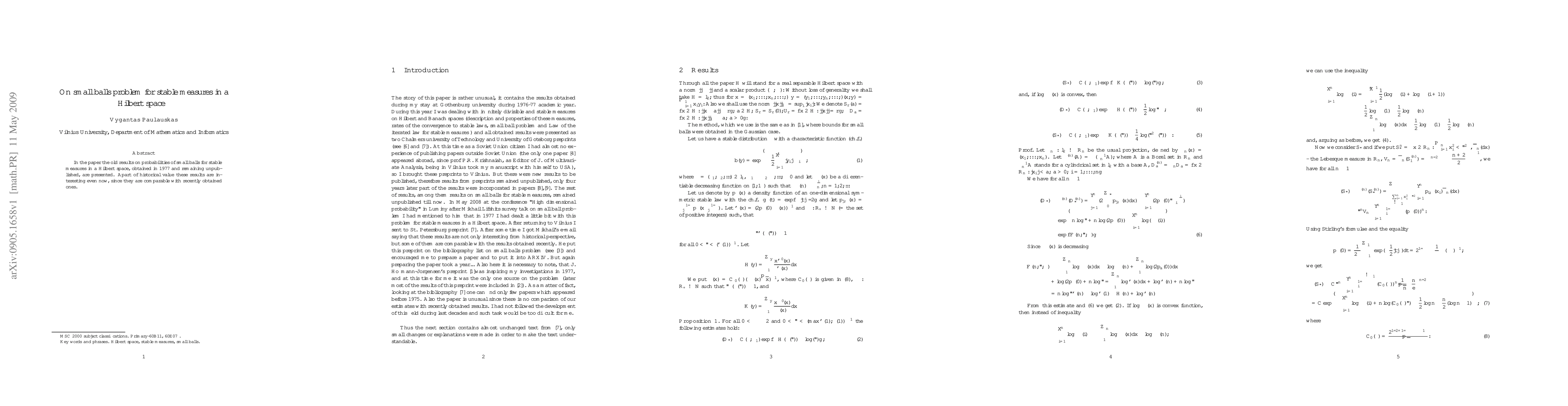 In the paper the old results on probabilities of small balls for stable measures in a Hilbert space, obtained in 1977 and remaining unpublished, are presented. Apart of historical value these results are interesting even now, since they are comparable with recently obtained ones.
