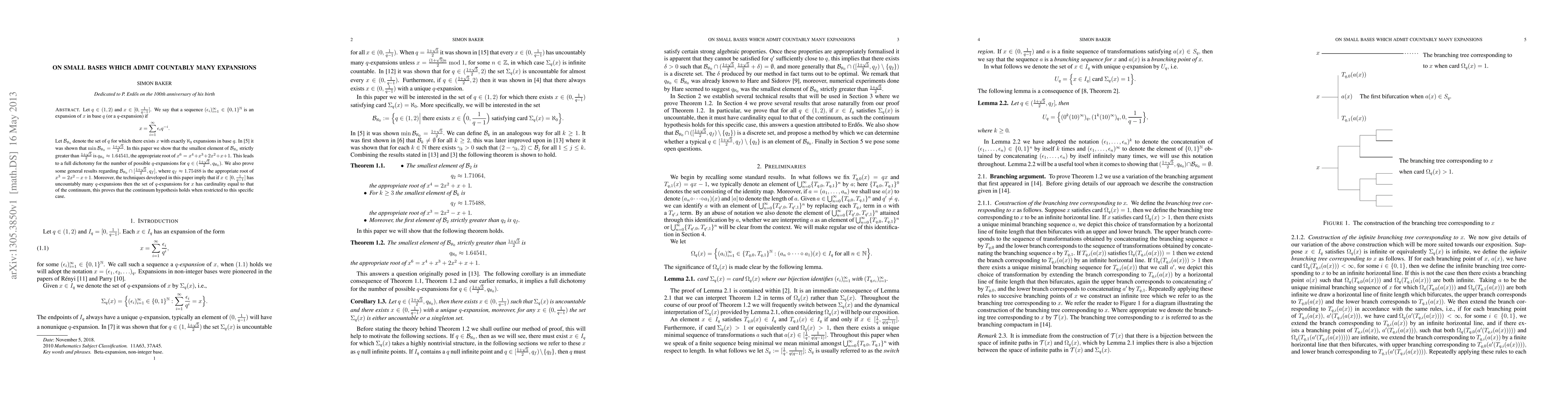 Let $q\in(1,2)$ and $x\in[0,\frac1{q-1}]$. We say that a sequence $(\epsilon_i)_{i=1}^{\infty}\in\{0,1\}^{\mathbb{N}}$ is an expansion of $x$ in base $q$ (or a $q$-expansion) if x=\sum_{i=1}^{\infty}\epsilon_iq^{-i}. Let $\mathcal{B}_{\aleph_{0}}$ denote the set of $q$ for which there exists $x$ with exactly $\aleph_{0}$ expansions in base $q$. In \cite{EHJ} it was shown that $\min\mathcal{B}_{\aleph_{0}}=\frac{1+\sqrt{5}}{2}.$ In this paper we show that the smallest element of $\mathcal{B}_{\aleph_{0}}$ strictly greater than $\frac{1+\sqrt{5}}{2}$ is $q_{\aleph_{0}}\approx1.64541$, the appropriate root of $x^6=x^4+x^3+2x^2+x+1$. This leads to a full dichotomy for the number of possible $q$-expansions for $q\in (\frac{1+\sqrt{5}}{2},q_{\aleph_{0}})$. We also prove some general results regarding $\mathcal{B}_{\aleph_{0}}\cap[\frac{1+\sqrt{5}}{2},q_{f}],$ where $q_{f}\approx 1.75488$ is the appropriate root of $x^{3}=2x^{2}-x+1.$ Moreover, the techniques developed in this paper imply that if $x\in [0,\frac{1}{q-1}]$ has uncountably many $q$-expansions then the set of $q$-expansions for $x$ has cardinality equal to that of the continuum, this proves that the continuum hypothesis holds when restricted to this specific case.