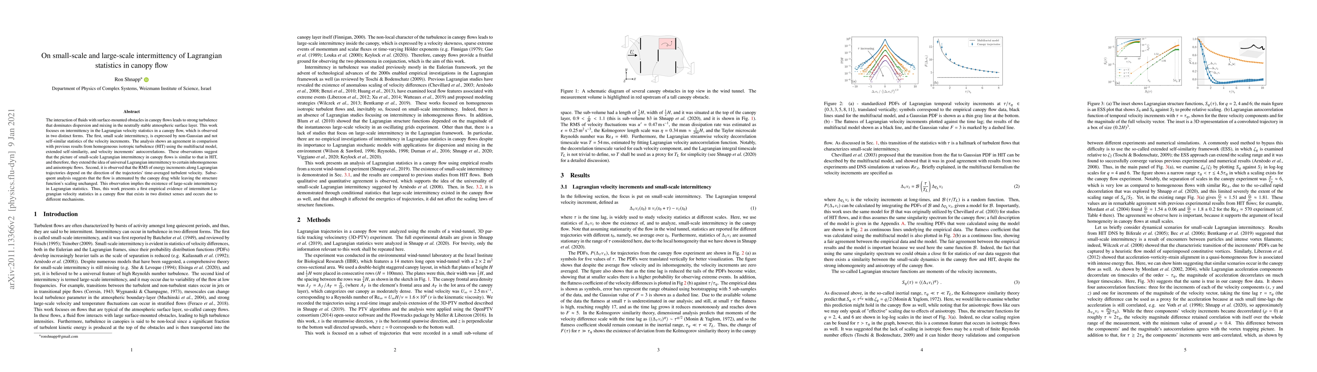 The interaction of fluids with surface-mounted obstacles in canopy flows leads to strong turbulence that dominates dispersion and mixing in the neutrally stable atmospheric surface layer. This work focuses on intermittency in the Lagrangian velocity statistics in a canopy flow, which is observed in two distinct forms. The first, small scale intermittency, is expressed by non-Gaussian and not self-similar statistics of the velocity increments. The analysis shows an agreement in comparison with previous results from homogeneous isotropic turbulence (HIT) using the multifractal model, extended self-similarity, and acceleration autocorrelations. These observations suggest that the picture of small-scale Lagrangian intermittency in canopy flows is similar to that in HIT, and therefore, they extend the idea of universal Lagrangian intermittency to certain inhomogeneous and anisotropic flows. Second, it is observed that the RMS of energy increments along Lagrangian trajectories depend on the direction of the trajectories' time-averaged turbulent velocity. Subsequent analysis suggests that the flow is attenuated by the canopy drag while leaving the structure function's scaling unchanged. This observation implies the existence of large-scale intermittency in Lagrangian statistics. Thus, this work presents a first empirical evidence of intermittent Lagrangian velocity statistics in a canopy flow that exists in two distinct senses and occurs due to different mechanisms.