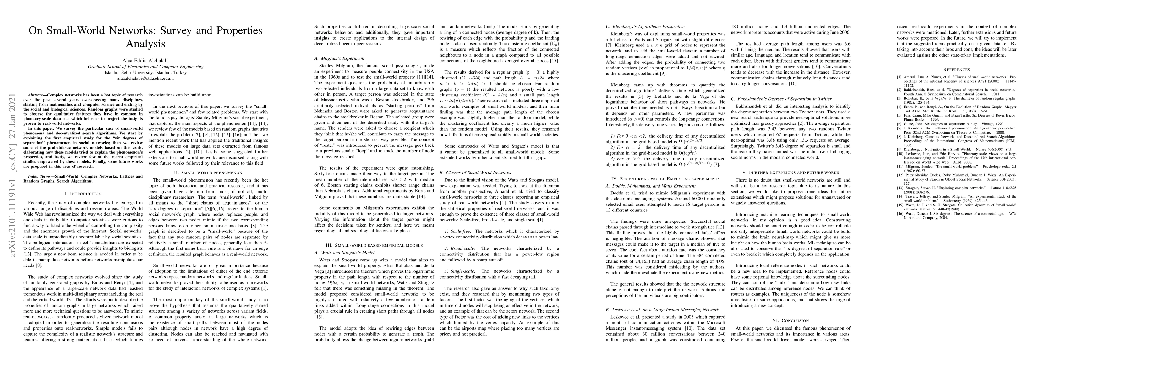 Complex networks has been a hot topic of research over the past several years over crossing many disciplines, starting from mathematics and computer science and ending by the social and biological sciences. Random graphs were studied to observe the qualitative features they have in common in planetary scale data sets which helps us to project the insights proven to real world networks. In this paper, We survey the particular case of small-world phenomena and decentralized search algorithms. We start by explaining the first empirical study for the six degrees of separation phenomenon in social networks; then we review some of the probabilistic network models based on this work, elaborating how these models tried to explain the phenomenon properties, and lastly, we review few of the recent empirical studies empowered by these models. Finally, some future works are proposed in this area of research.