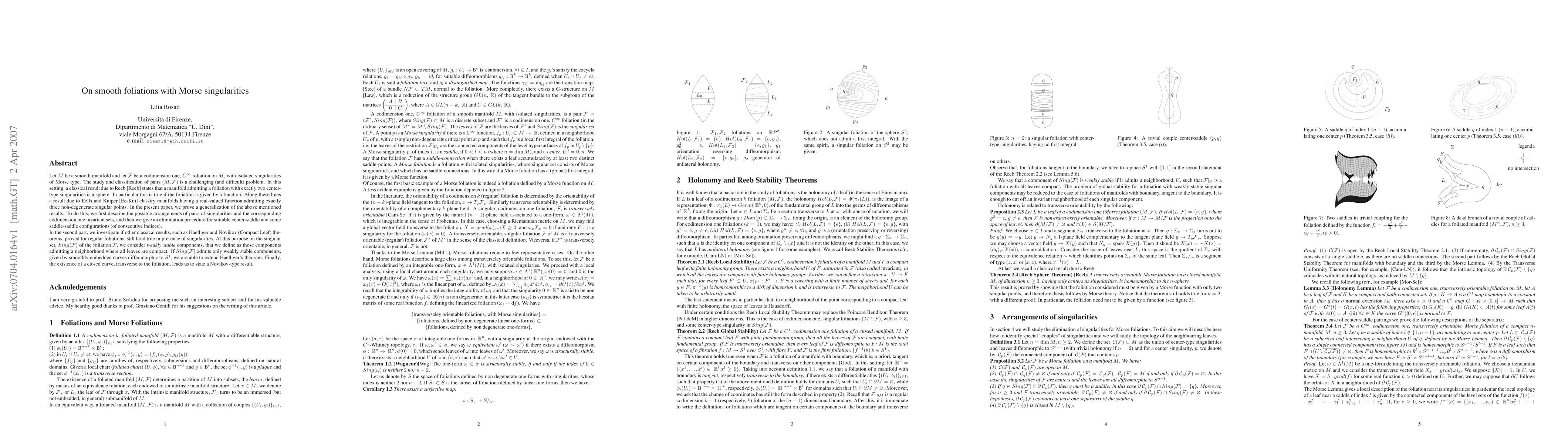 This paper generalizes classical results on smooth foliations with Morse singularities, describing arrangements of singularity pairs and elimination procedures for certain configurations. It extends Haefliger's theorem and establishes a Novikov-type result under specific conditions on the foliation's singularities.