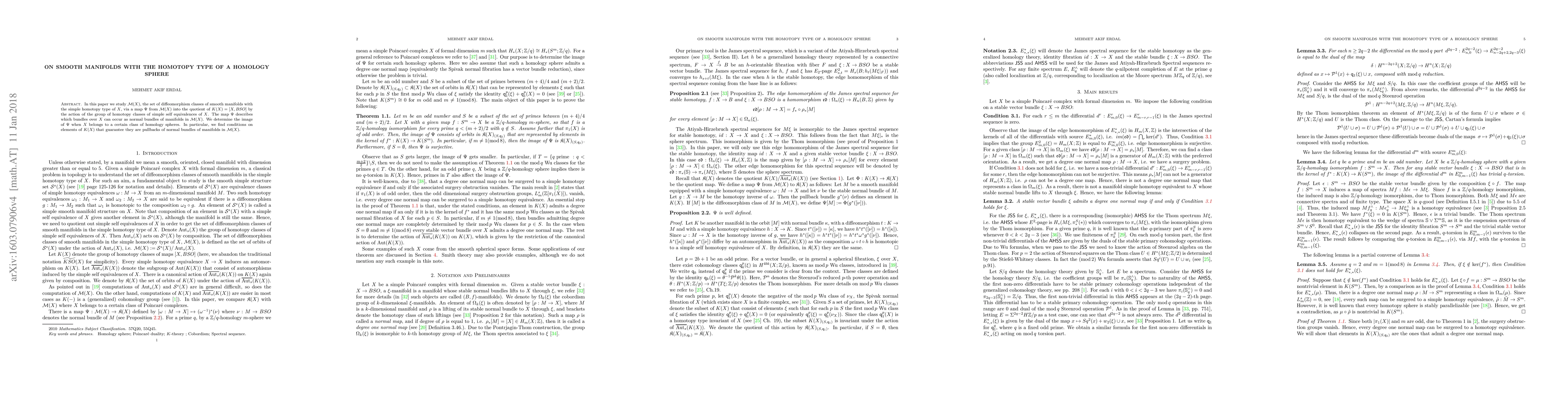 In this paper we study $\mathcal M(X)$, the set of diffeomorphism classes of smooth manifolds with the simple homotopy type of $X$, via a map $\Psi$ from $\mathcal M(X)$ into the quotient of $K(X)=[X,BSO]$ by the action of the group of homotopy classes of simple self equivalences of $X$. The map $\Psi$ describes which bundles over $X$ can occur as normal bundles of manifolds in $\mathcal M(X)$. We determine the image of $\Psi$ when $X$ belongs to a certain class of homology spheres. In particular, we find conditions on elements of $K(X)$ that guarantee they are pullbacks of normal bundles of manifolds in $\mathcal M(X)$.