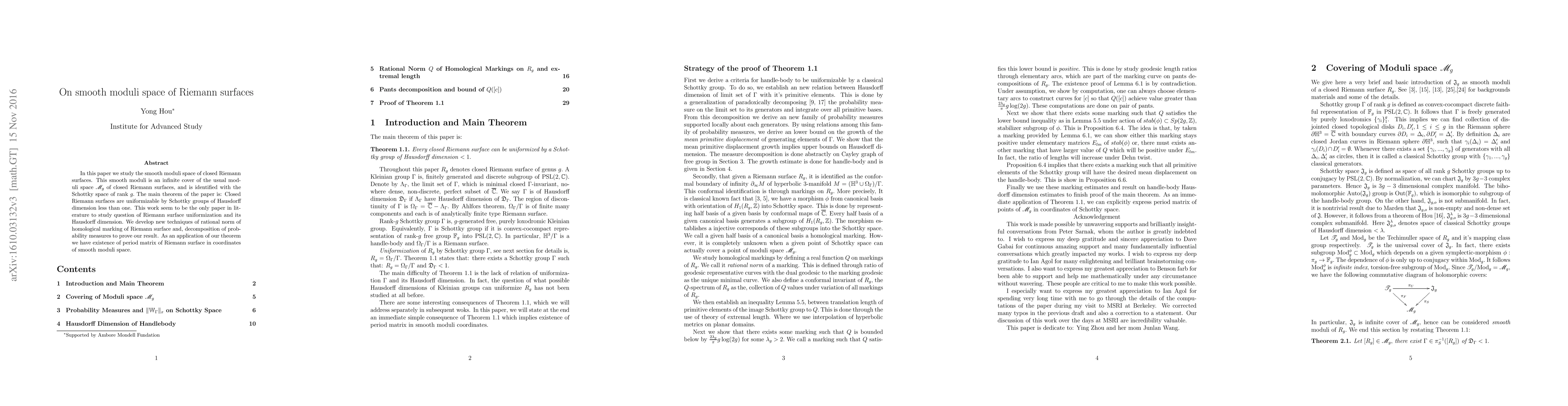 In this paper we study the smooth moduli space of closed Riemann surfaces. This smooth moduli is an infinite cover of the usual moduli space $\mathscr{M}_g$ of closed Riemann surfaces, and is identified with the Schottky space of rank $g.$ The main theorem of the paper is: Closed Riemann surfaces are uniformizable by Schottky groups of Hausdorff dimension less than one. This work seem to be the only paper in literature to study question of Riemann surface uniformization and its Hausdorff dimension. We develop new techniques of rational norm of homological marking of Riemann surface and, decomposition of probability measures to prove our result. As an application of our theorem we have existence of period matrix of Riemann surface in coordinates of smooth moduli space.