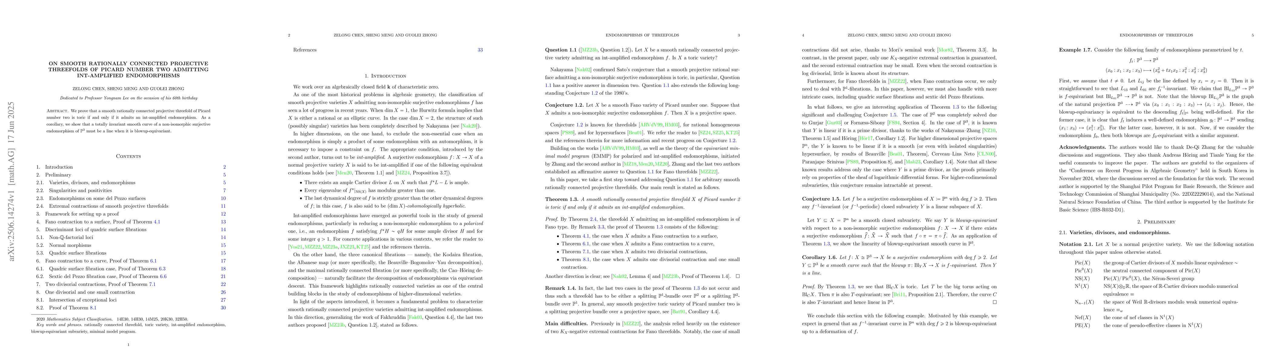 We prove that a smooth rationally connected projective threefold of Picard number two is toric if and only if it admits an int-amplified endomorphism. As a corollary, we show that a totally invariant smooth curve of a non-isomorphic surjective endomorphism of $\mathbb{P}^3$ must be a line when it is blowup-equivariant.
