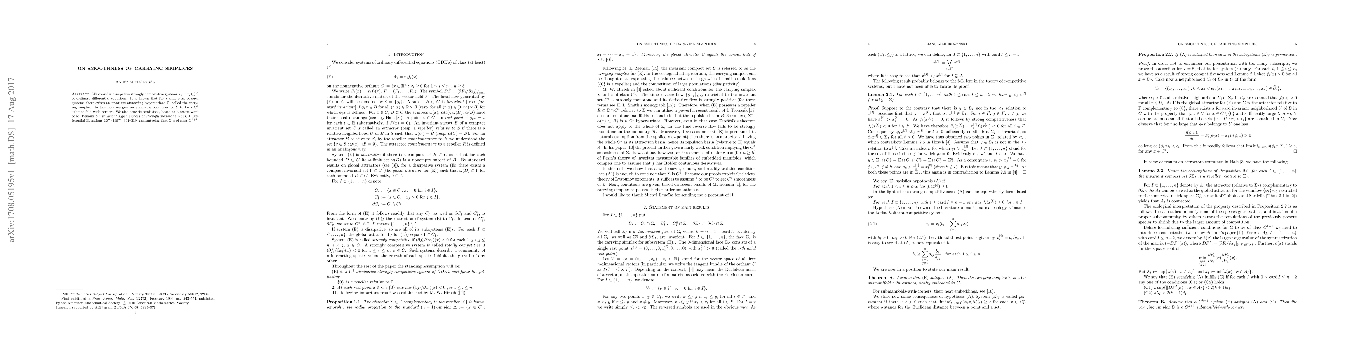 We consider dissipative strongly competitive systems $\dot{x}_{i}=x_{i}f_{i}(x)$ of ordinary differential equations. It is known that for a wide class of such systems there exists an invariant attracting hypersurface $\Sigma$, called the carrying simplex. In this note we give an amenable condition for $\Sigma$ to be a $C^{1}$ submanifold-with-corners. We also provide conditions, based on a recent work of M. Bena\"{\i}m "On invariant hypersurfaces of strongly monotone maps", J. Differential Equations 137 (1997), 302-319, guaranteeing that $\Sigma$ is of class $C^{k+1}$.