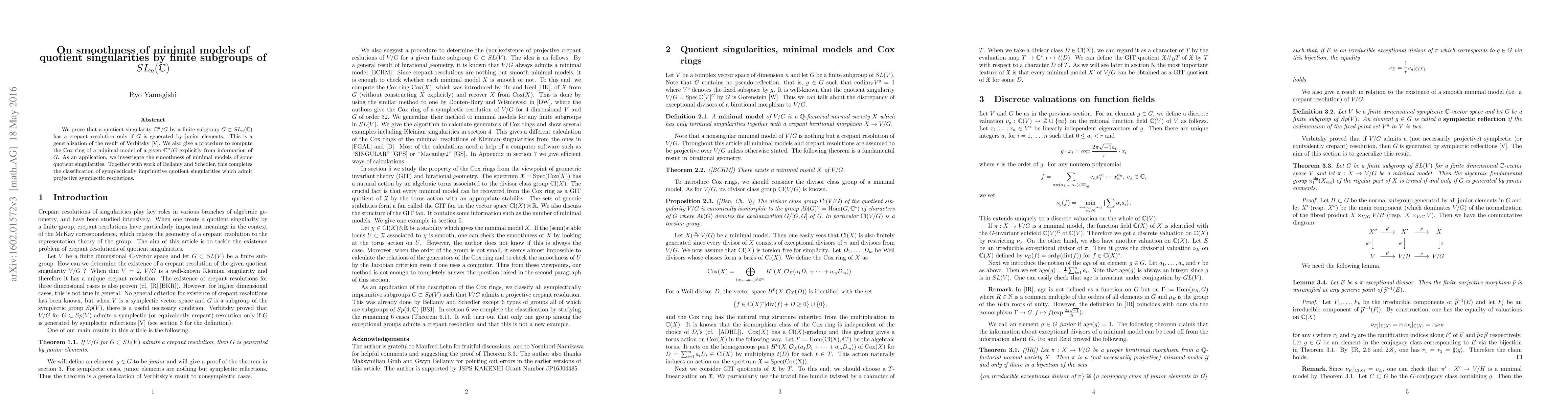 We prove that a quotient singularity $\mathbb{C}^n/G $ by a finite subgroup $G\subset SL_n(\mathbb{C})$ has a crepant resolution only if $G $ is generated by junior elements. This is a generalization of the result of Verbitsky [V]. We also give a procedure to compute the Cox ring of a minimal model of a given $\mathbb{C}^n/G$ explicitly from information of $G$. As an application, we investigate the smoothness of minimal models of some quotient singularities. Together with work of Bellamy and Schedler, this completes the classification of symplectically imprimitive quotient singularities which admit projective symplectic resolutions.