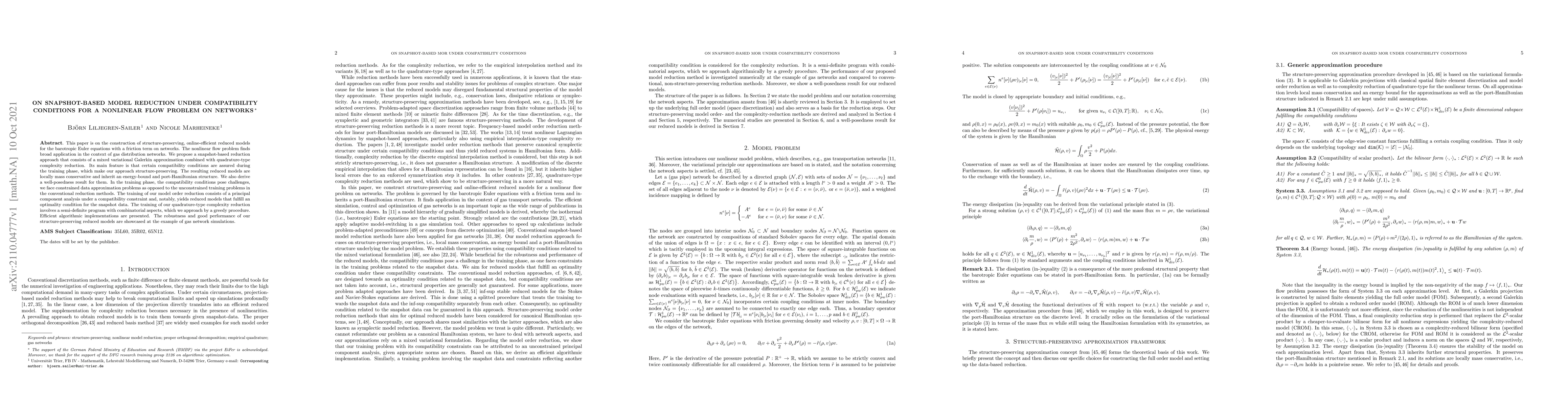 This paper is on the construction of structure-preserving, online-efficient reduced models for the barotropic Euler equations with a friction term on networks. The nonlinear flow problem finds broad application in the context of gas distribution networks. We propose a snapshot-based reduction approach that consists of a mixed variational Galerkin approximation combined with quadrature-type complexity reduction. Its main feature is that certain compatibility conditions are assured during the training phase, which make our approach structure-preserving. The resulting reduced models are locally mass conservative and inherit an energy-bound and port-Hamiltonian structure. We also derive a well-posedness result for them. In the training phase, the compatibility conditions pose challenges, we face constrained data approximation problems as opposed to the unconstrained training problems in the conventional reduction methods. The training of our model order reduction consists of a principal component analysis under a compatibility constraint and, notably, yields reduced models that fulfill an optimality condition for the snapshot data. The training of our quadrature-type complexity reduction involves a semi-definite program with combinatorial aspects, which we approach by a greedy procedure.