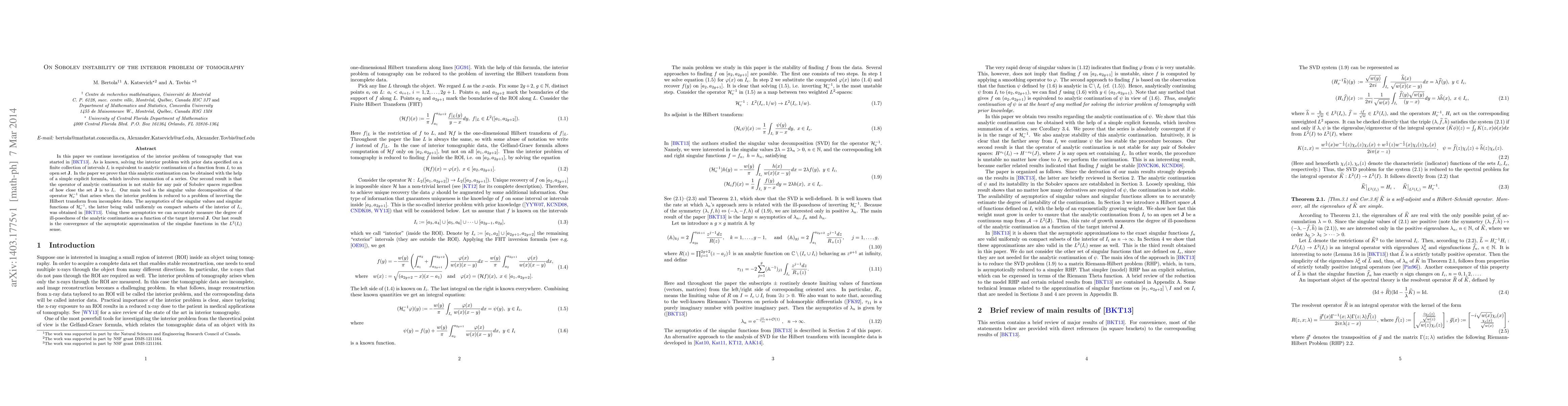 In this paper we continue investigation of the interior problem of tomography that was started in \cite{BKT2}. As is known, solving the interior problem {with prior data specified on a finite collection of intervals $I_i$} is equivalent to analytic continuation of a function from $I_i$ to an open set ${\bf J}$. In the paper we prove that this analytic continuation can be obtained with the help of a simple explicit formula, which involves summation of a series. Our second result is that the operator of analytic continuation is not stable for any pair of Sobolev spaces regardless of how close the set ${\bf J}$ is to $I_i$. Our main tool is the singular value decomposition of the operator $\mathcal H^{-1}_e$ that arises when the interior problem is reduced to a problem of inverting the Hilbert transform from incomplete data. The asymptotics of the singular values and singular functions of $\mathcal H^{-1}_e$, the latter being valid uniformly on compact subsets {of the interior of $I_i$}, was obtained in \cite{BKT2}. {Using these asymptotics we can accurately measure the degree of ill-posedness of the analytic continuation as a function of the target interval ${\bf J}$.} Our {last} result is the convergence of the asymptotic approximation of the singular functions {in the $L^2(I_i)$ sense}.