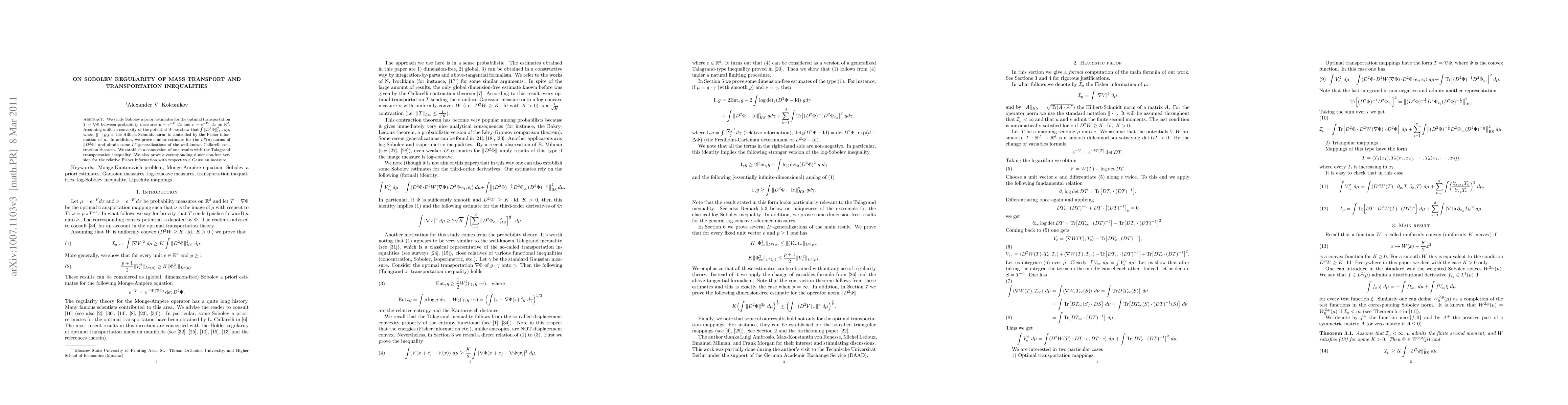 We study Sobolev a priori estimates for the optimal transportation $T = \nabla \Phi$ between probability measures $\mu=e^{-V} \ dx$ and $\nu=e^{-W} \ dx$ on $\R^d$. Assuming uniform convexity of the potential $W$ we show that $\int \| D^2 \Phi\|^2_{HS} \ d\mu$, where $\|\cdot\|_{HS}$ is the Hilbert-Schmidt norm, is controlled by the Fisher information of $\mu$. In addition, we prove similar estimate for the $L^p(\mu)$-norms of $\|D^2 \Phi\|$ and obtain some $L^p$-generalizations of the well-known Caffarelli contraction theorem. We establish a connection of our results with the Talagrand transportation inequality. We also prove a corresponding dimension-free version for the relative Fisher information with respect to a Gaussian measure.