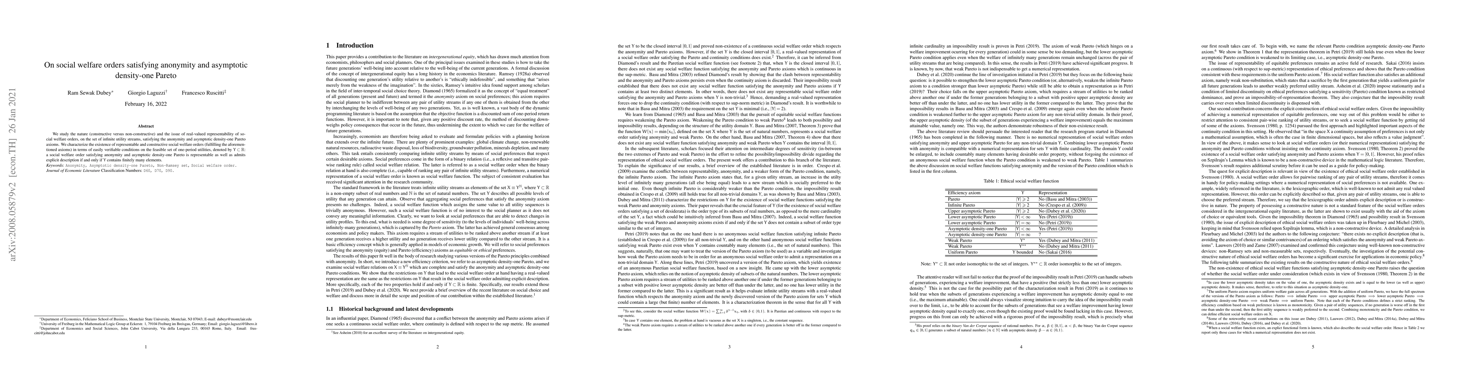 This paper investigates the nature and representability of social welfare orders for infinite utility streams under finite anonymity, focusing on the new efficiency concept of asymptotic density-one Pareto. It characterizes the existence of such orders through conditions on the feasible set of one-period utilities.