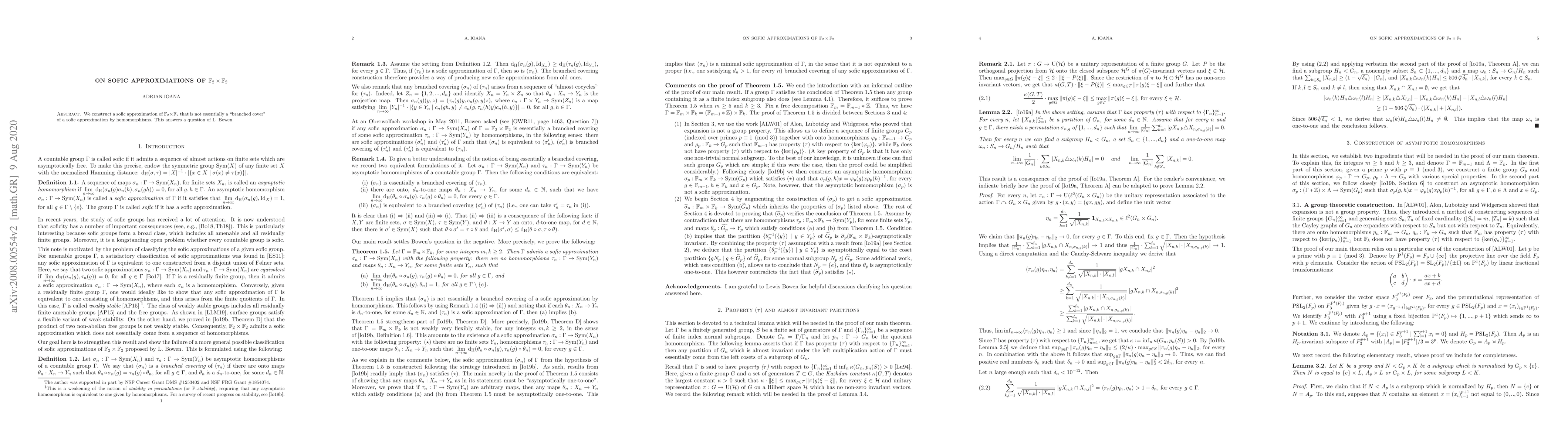 Summary: The paper constructs a novel sofic approximation for the direct product $\mathbb F_2\times\mathbb F_2$ that differs from a branched cover, resolving a question posed by L. Bowen. This work provides a significant advancement in understanding sofic approximations.